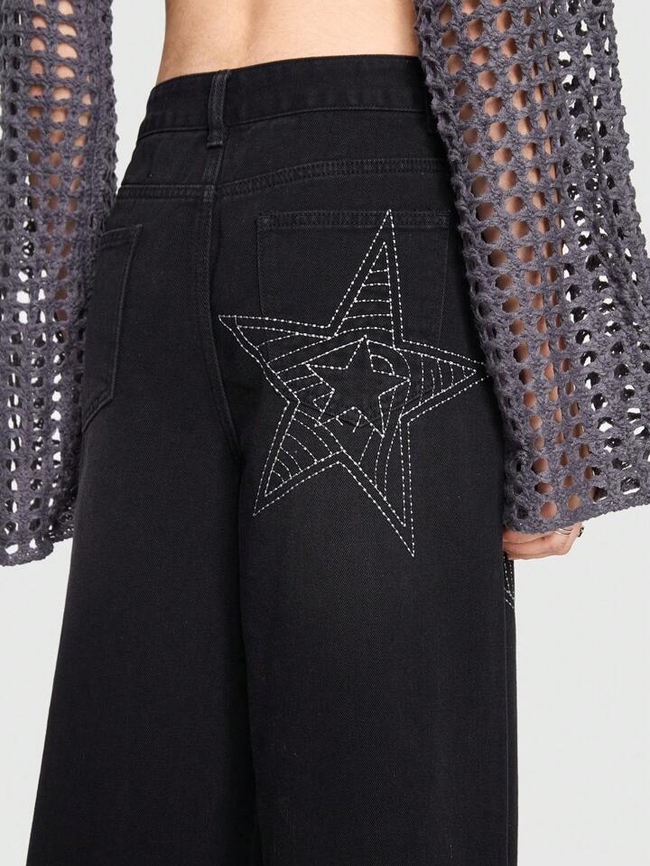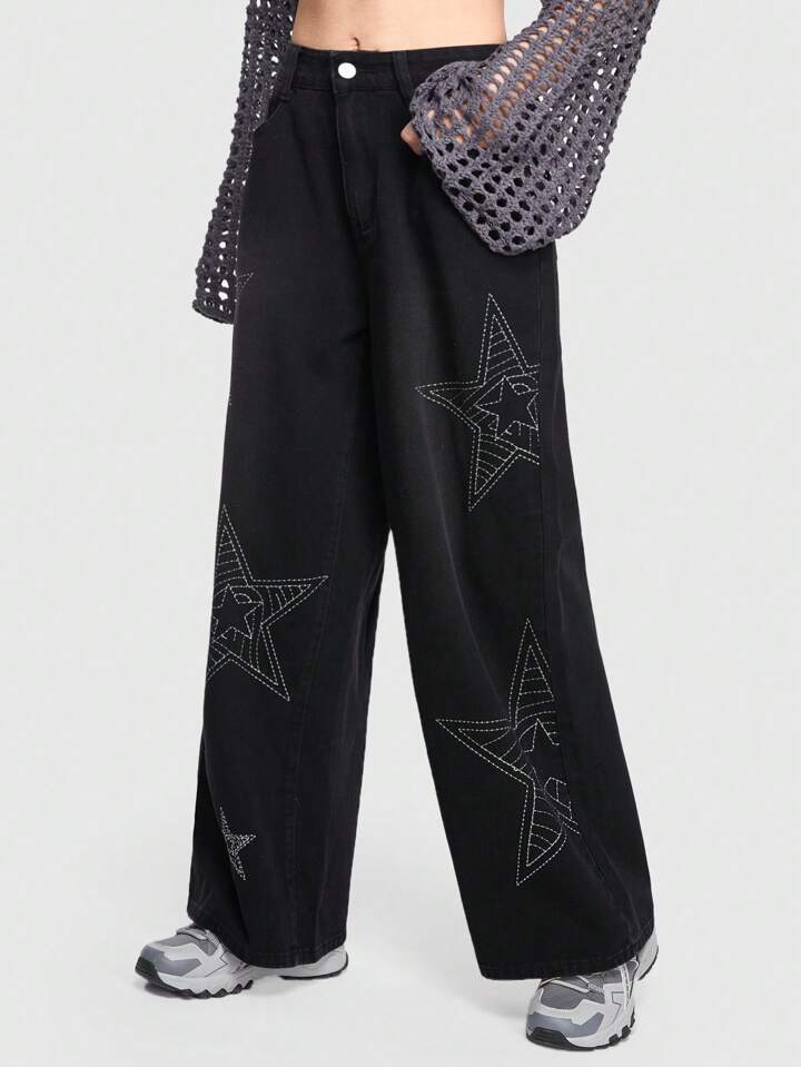 Grunge Punk Street Style Linear Star Embroidery Jeans For Casual Wear