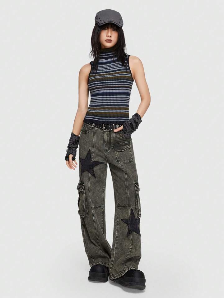 Grunge Punk Striped Pattern Turtleneck Sweater Vest