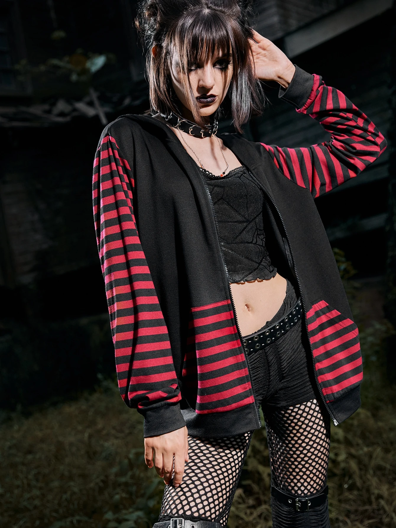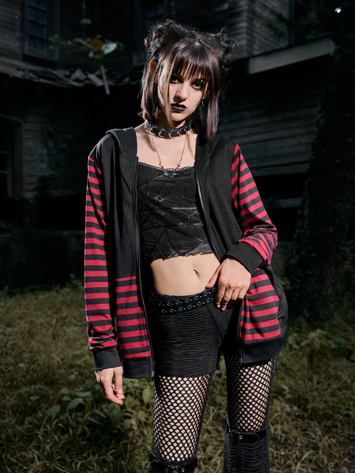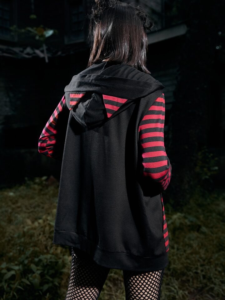 Grunge Punk Striped Zip Up 3D Ear Design Drawstring Hoodie