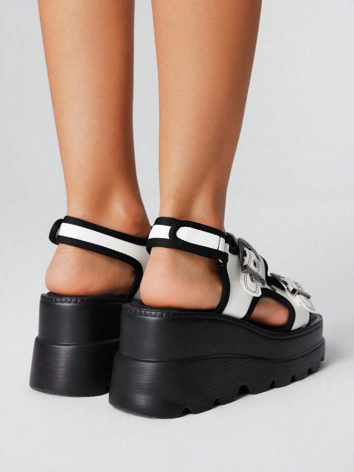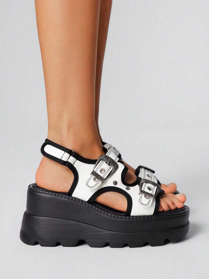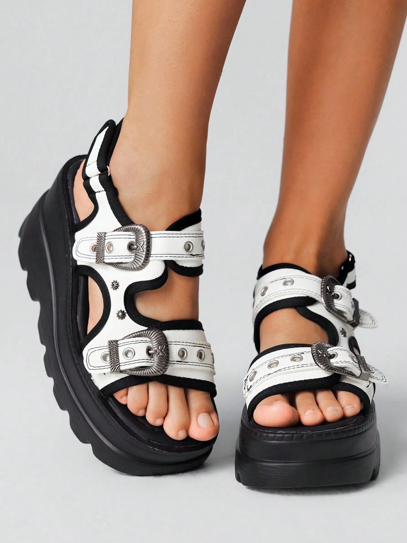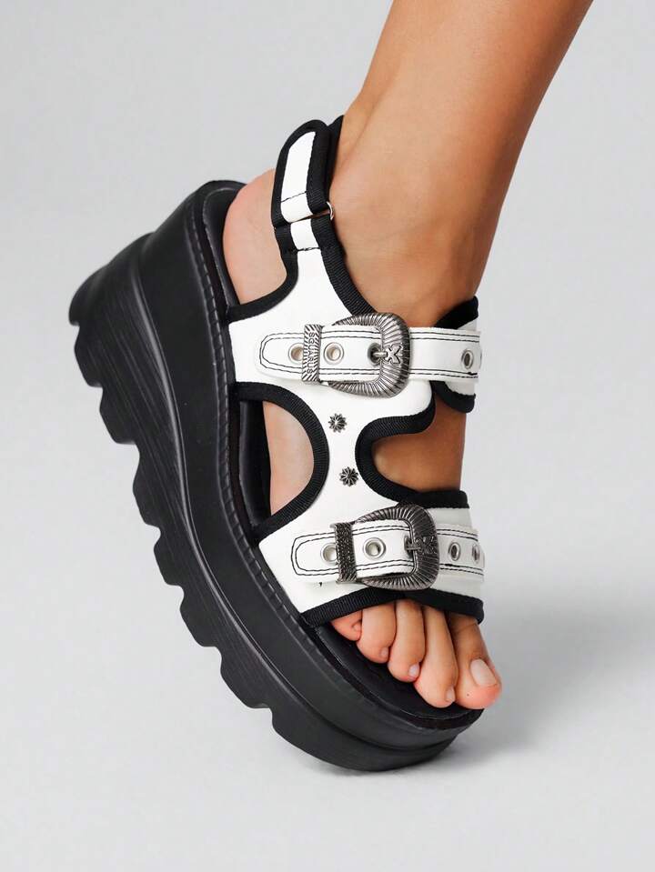 Grunge Punk Summer Women's Gothic Punk Rock Platform Sandals, Black Goth Roman Beach Studded Wedge Thick Sole Sandals, Halloween
