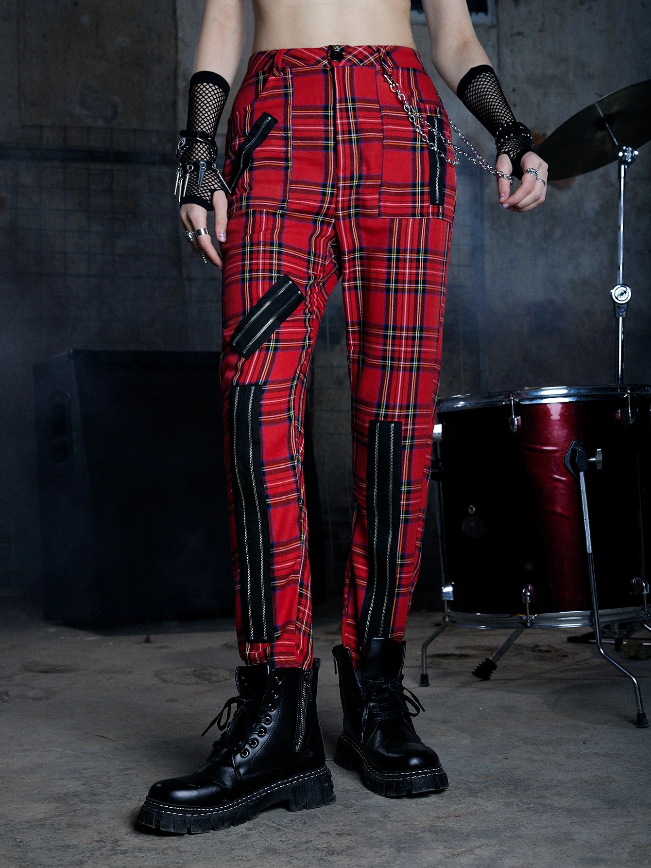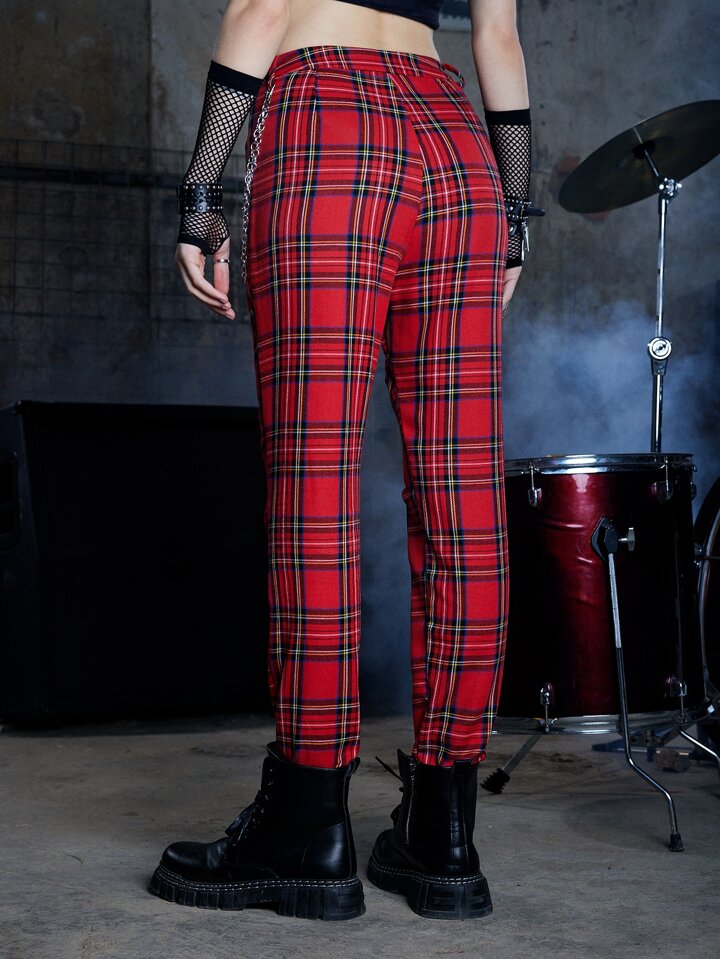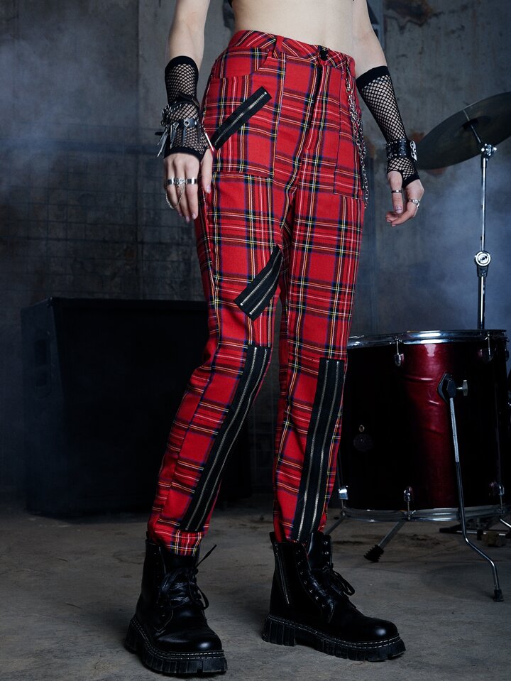 Grunge Punk Tartan Print Zip Detail Pants