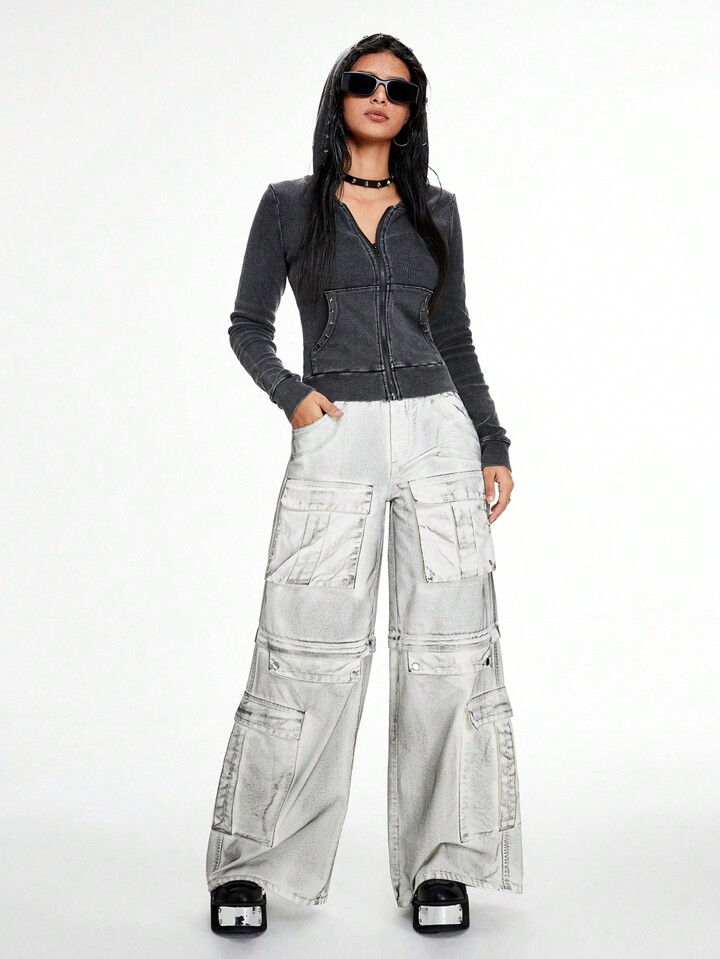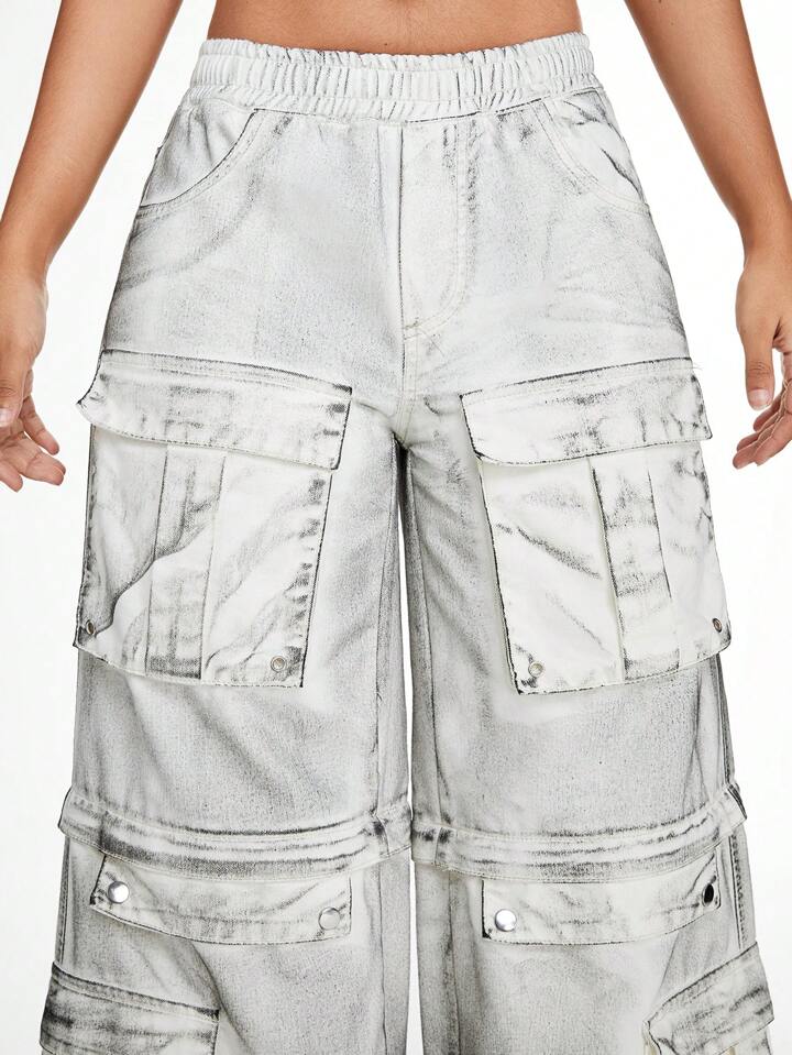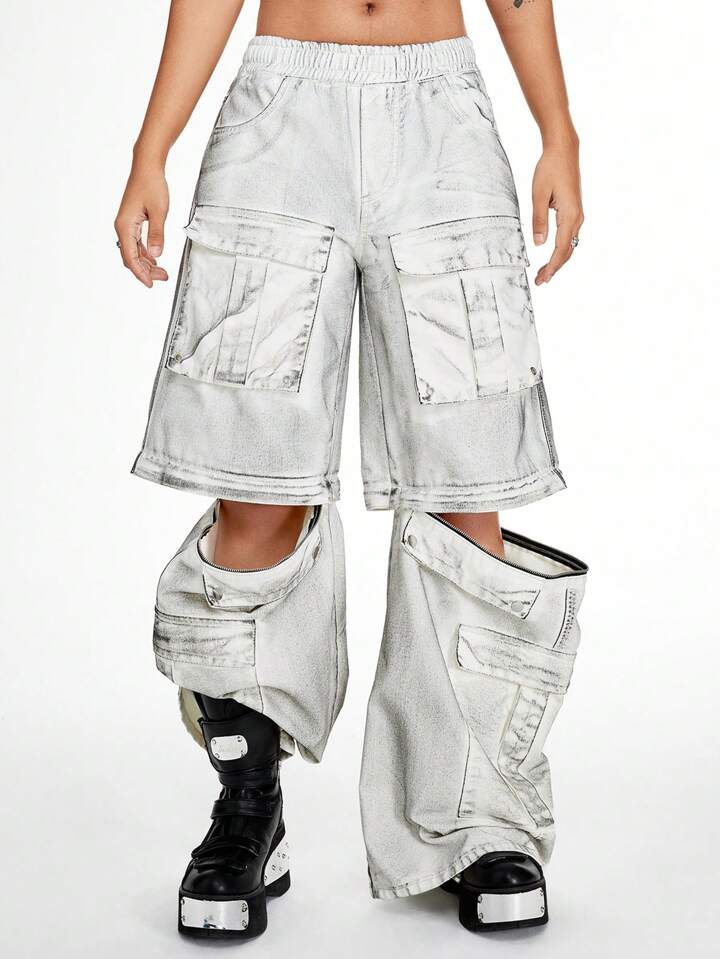 Grunge Punk Unisex Pioneer Vintage Distressed Multi-Pocket Detachable Two-Way Baggy Wide Leg Cargo Jeans