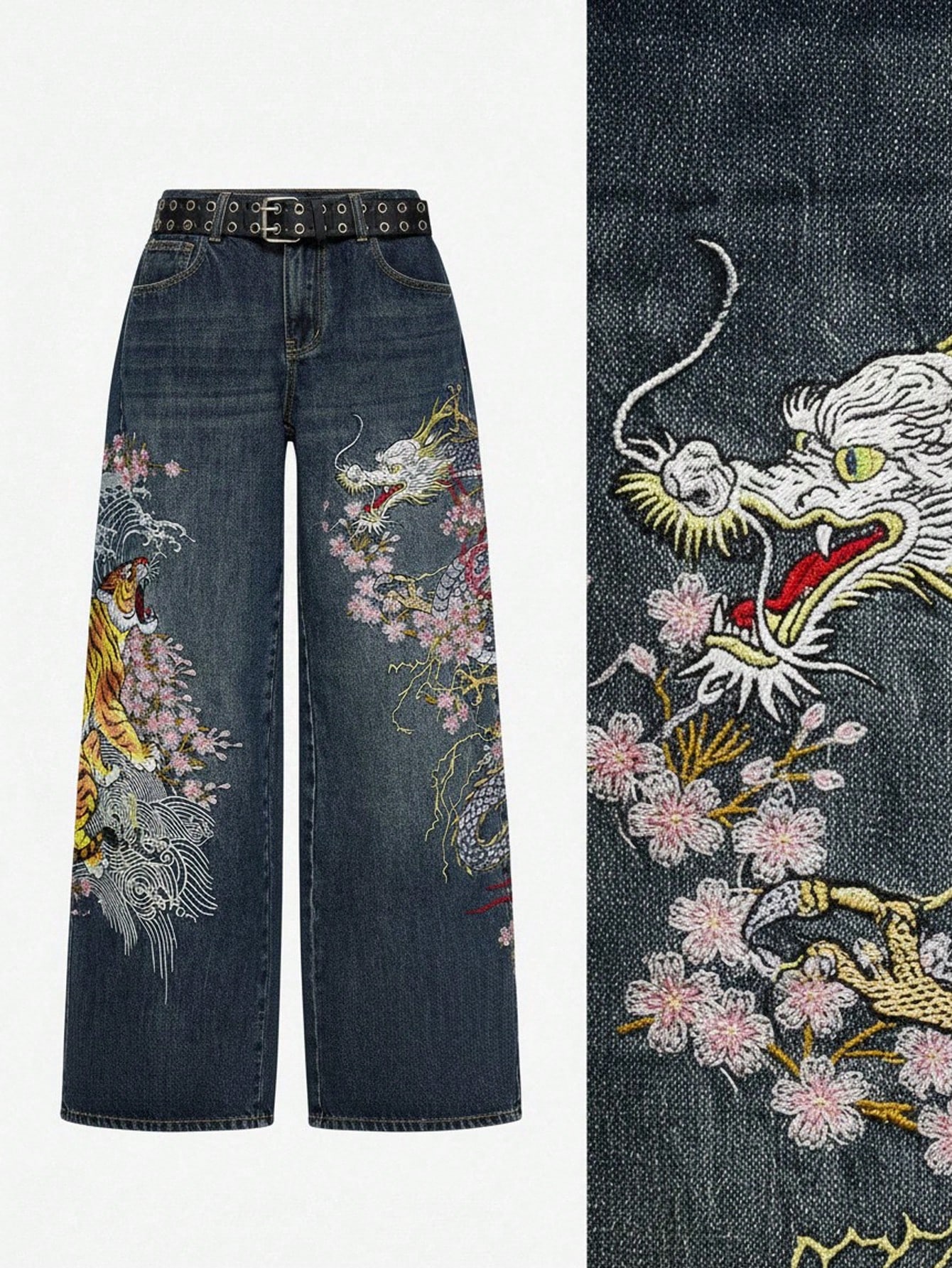 Grunge Punk Unisex Retro Street-Style Chinese Tiger & Floral Embroidery Loose Wide-Leg Jeans