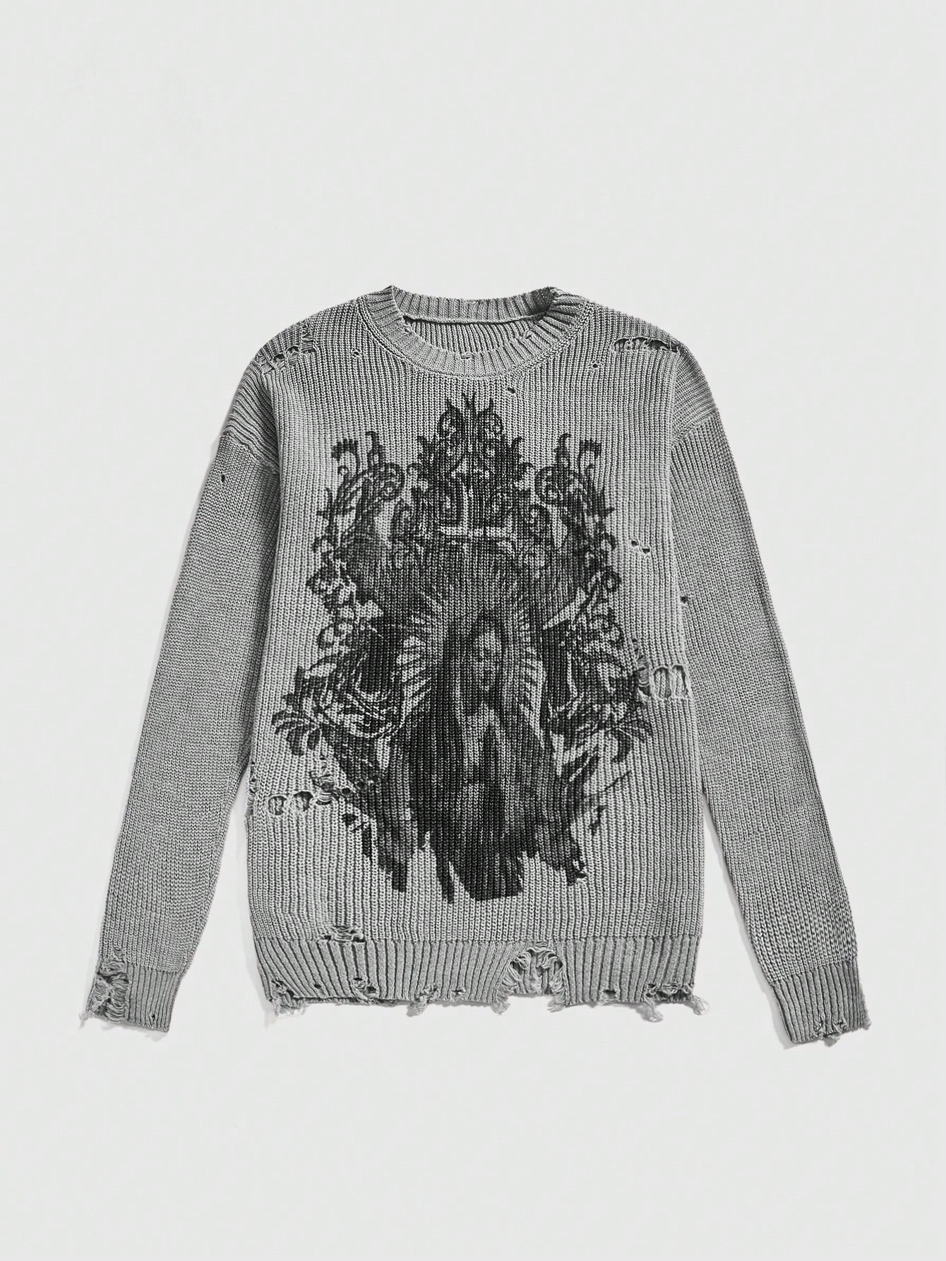 Grunge Punk Vintage Dark Print Distressed Sweater For Women, Autumn, Oversized Loose Knit Design