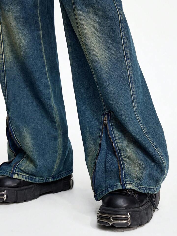 Grunge Punk Vintage Distressed Utility Loose Fit Jeans With Multiple Pockets, Suitable For Music Festivals