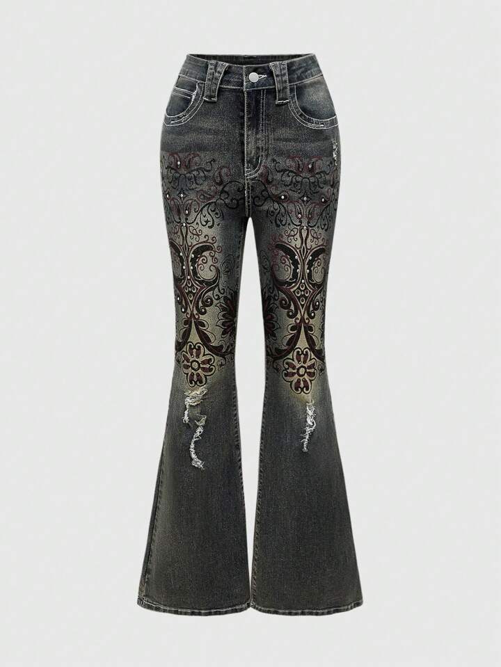 Grunge Punk Vintage Hippie Floral Vine Studded High Stretch Flare Jeans For Women