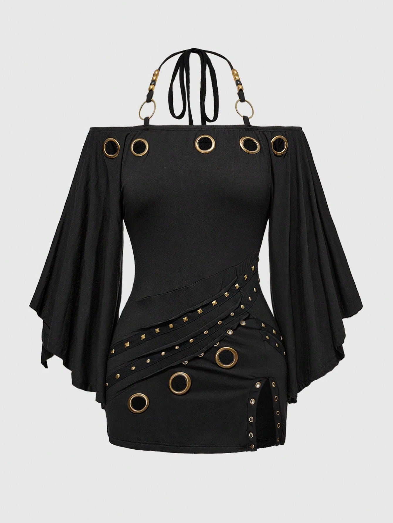 Grunge Punk Vintage Loose Off Shoulder Metal Grommet Decor Batwing Sleeve Women T-Shirt