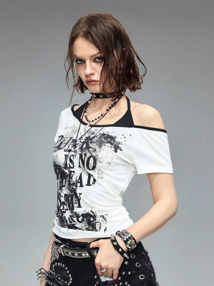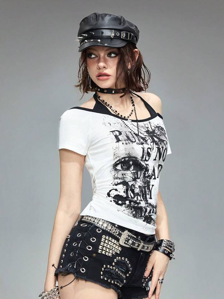 Grunge Punk Vintage Y2K Graffiti Letter & Eye Print Women Seamless Form-Fitting Short Sleeve T-Shirt