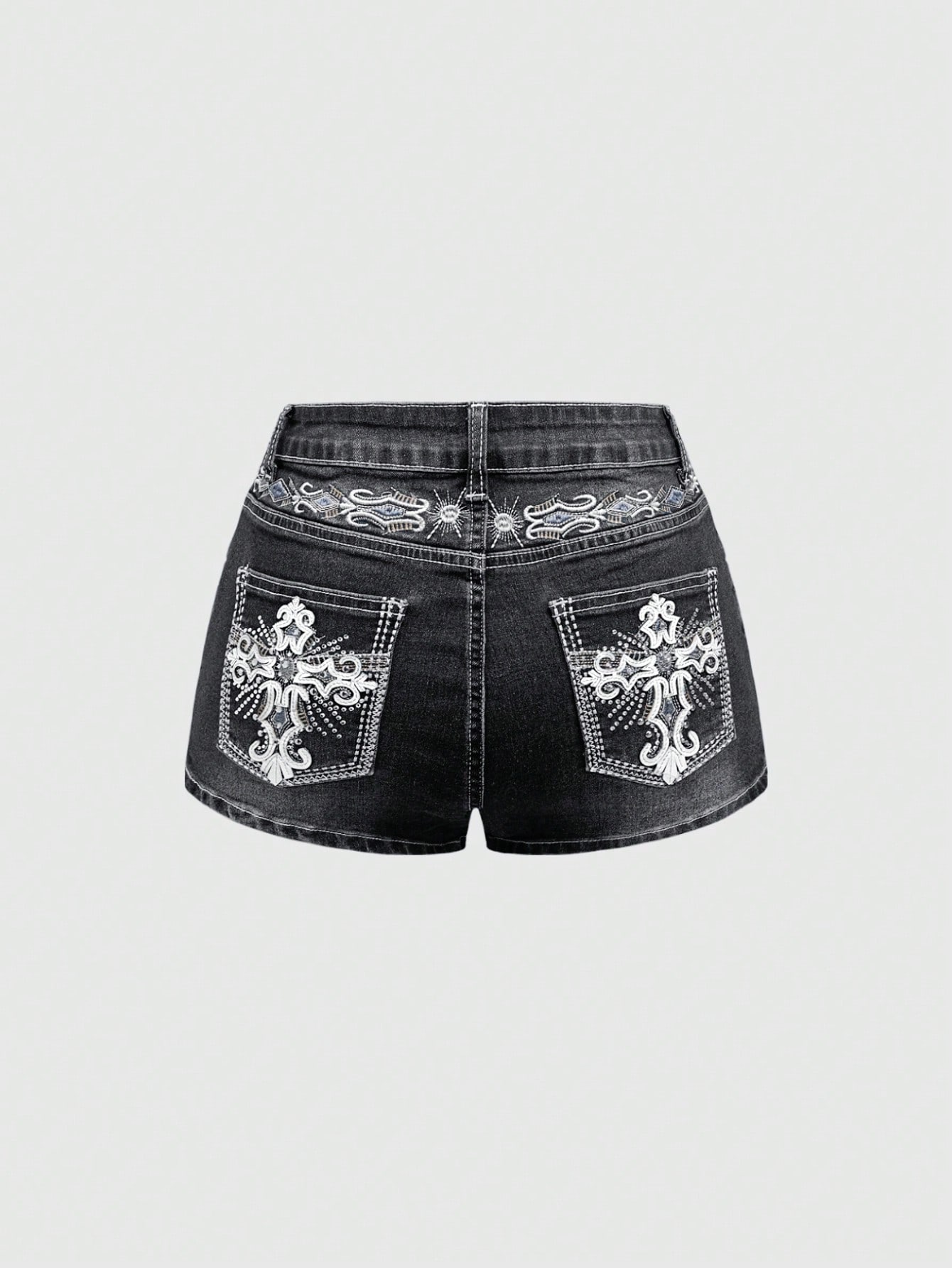 Grunge Punk Vintage Y2K Punk Style Fitted Women Denim Shorts With Embroidered Pocket & Wing Design, Navy Blue, Button, Pocket, Zipper, Low Waist Flare Leg, Casual Wear For Spring/Autumn
