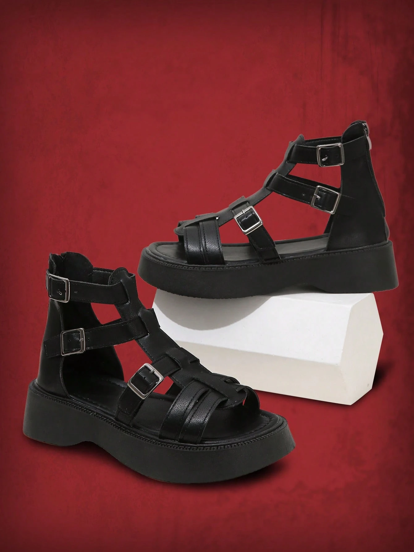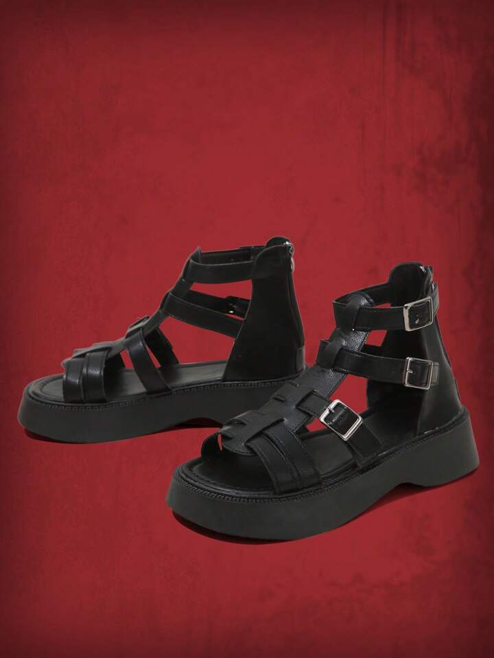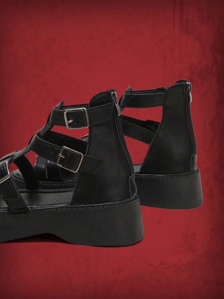 Grunge Punk Women Buckle Decor Ankle Strap Sandals, Punk Black Wedge Sandals