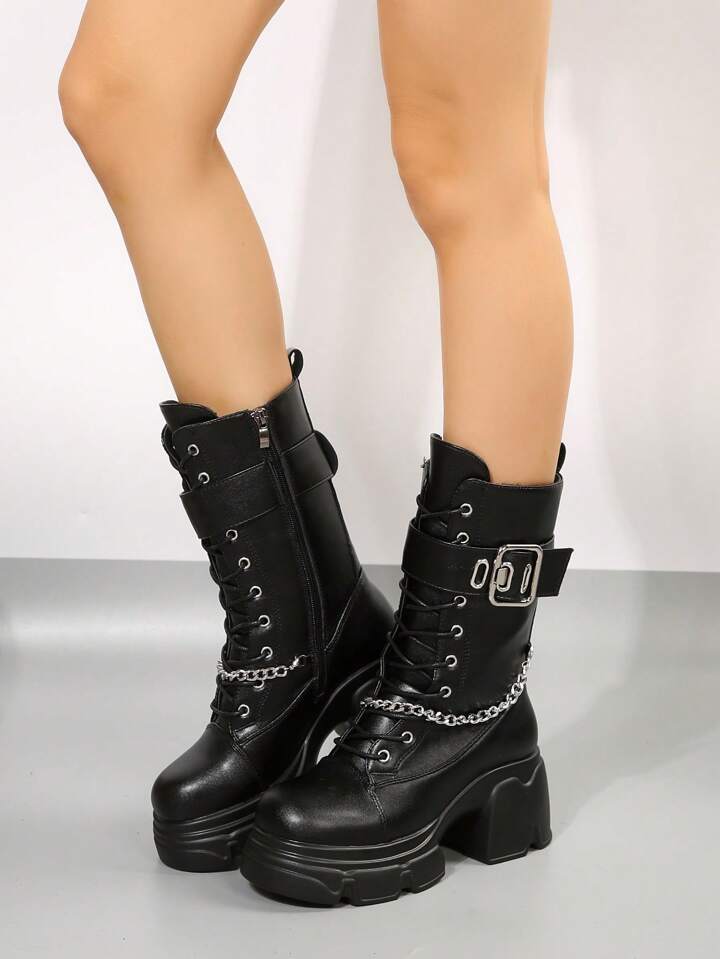Grunge Punk Women Buckle Decor Lace-up Front Chain Decor Combat Boots, Punk Outdoor Fashion Boots
