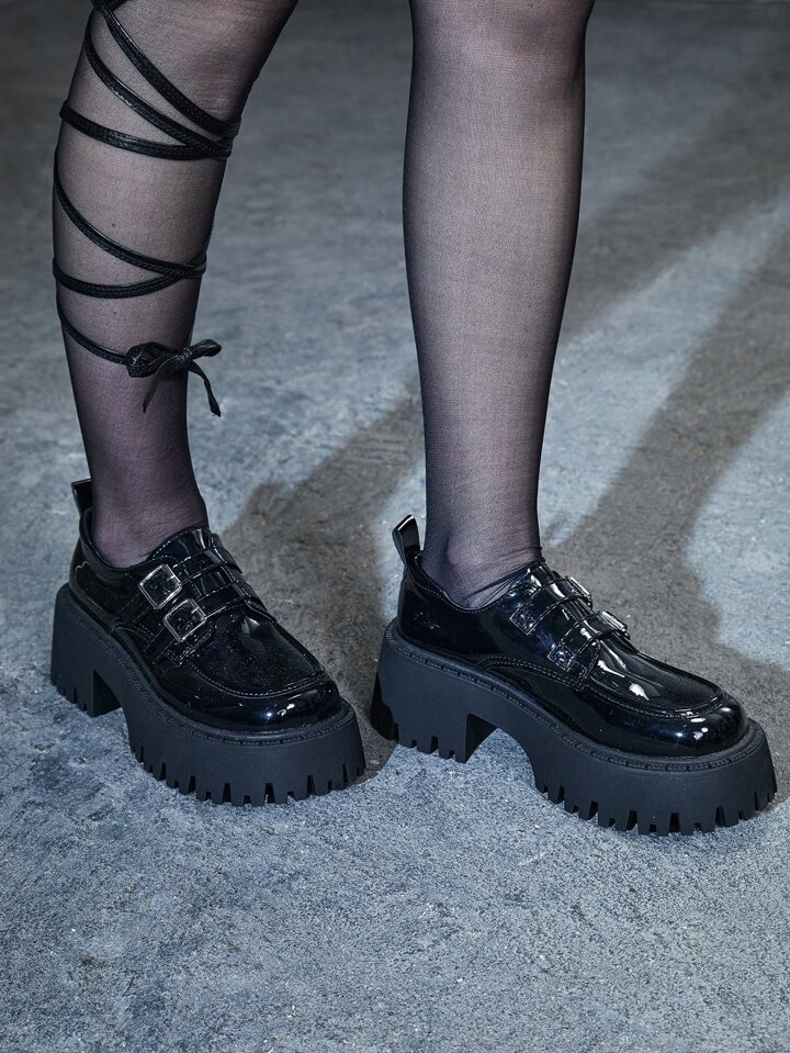 Grunge Punk Women Buckle Decor Loafers Elegant Flatform Shoes Black