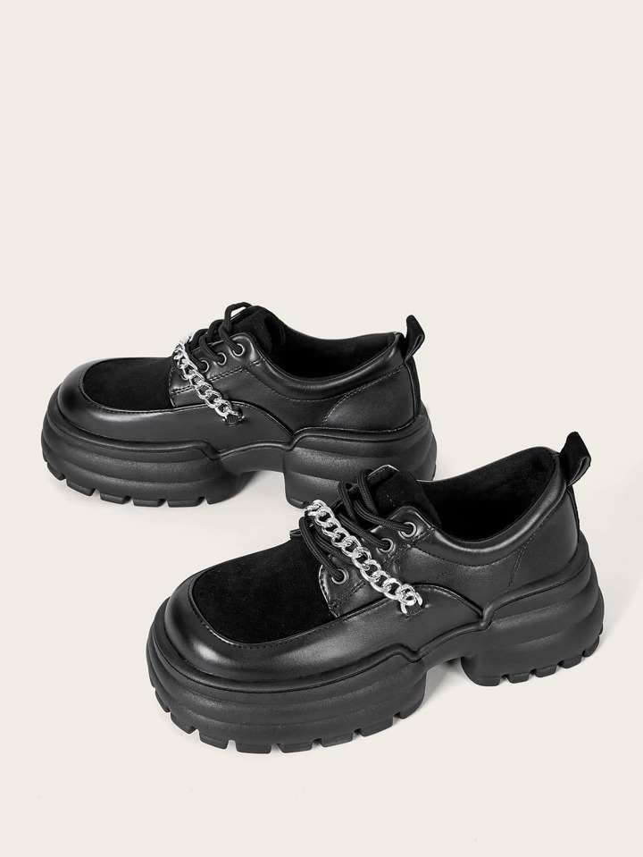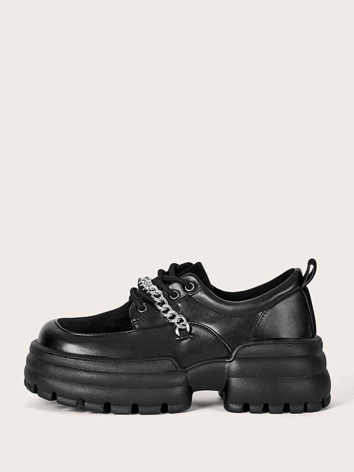Grunge Punk Women Chain Decor Lace-up Front Flatform Punk Black Oxford Shoes
