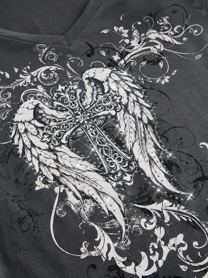 Grunge Punk Women Cross & Wing Print V-Neck Flare Sleeve T-Shirt