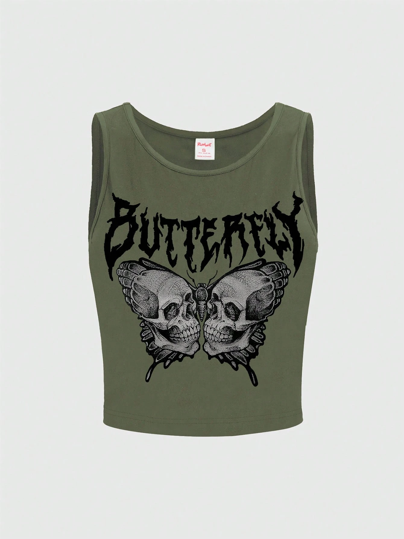 Grunge Punk Women Gothic Skeleton Butterfly Letter Print Tank Top
