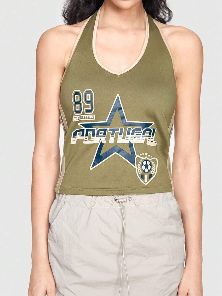 Grunge Punk Women'S Star, Letter Printed Halter Tank Top With Color Block & Insert Trim Detail
