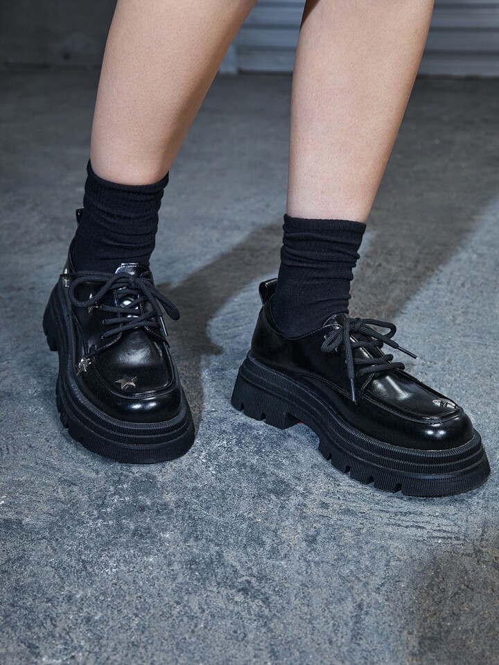 Grunge Punk Women Star Decor Oxfords Lace-up Front Elegant Wedge Shoes Black
