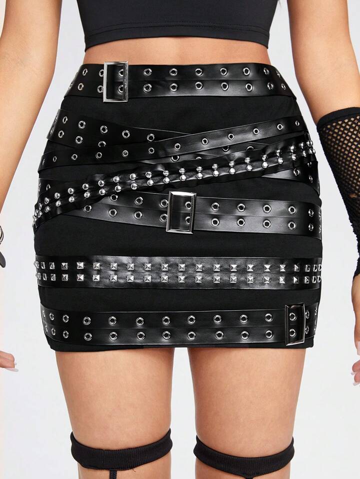 Grunge Punk Women Studded Belt Bodycon Mini Skirt