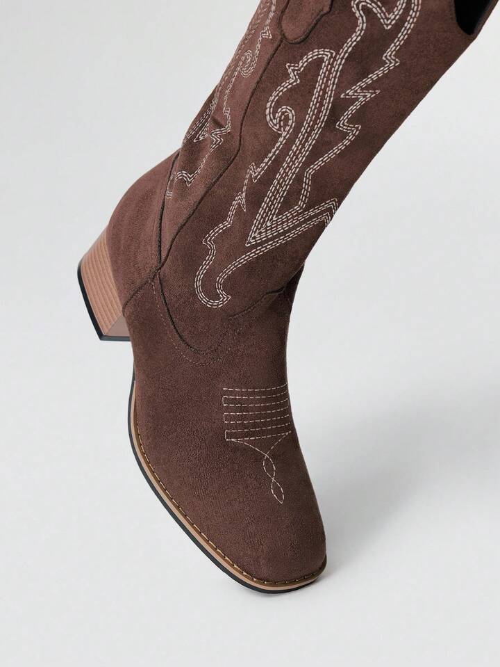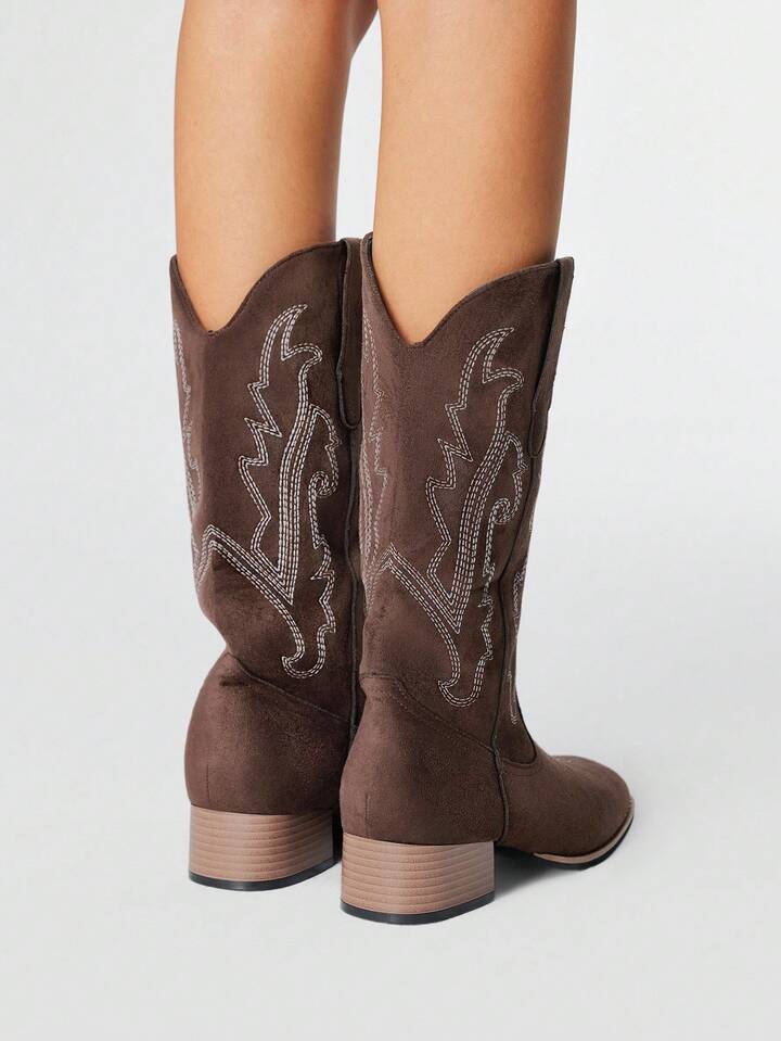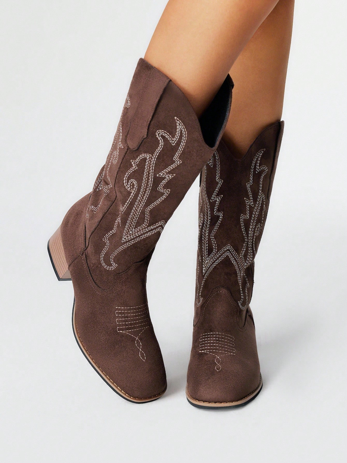 Grunge Punk Women's 2025 Autumn/Winter Brown New Outdoor Fashion Embroidery Detail Pointed Toe Chunky Heel Western Cowboy Ankle Boots, Slip-On