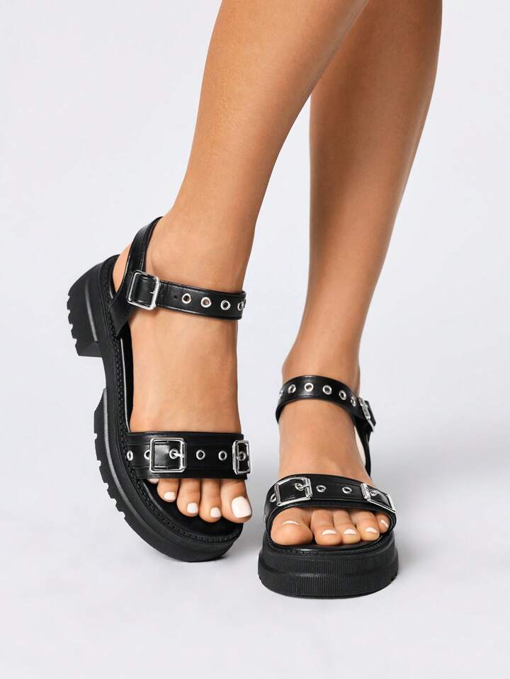 Grunge Punk Women's Black Open Toe Platform Sandals, 5.5cm Thick Sole, Dark Punk Metal Buckle Strap Design, Versatile Daily Fashion, Casual Student Beach Wear
