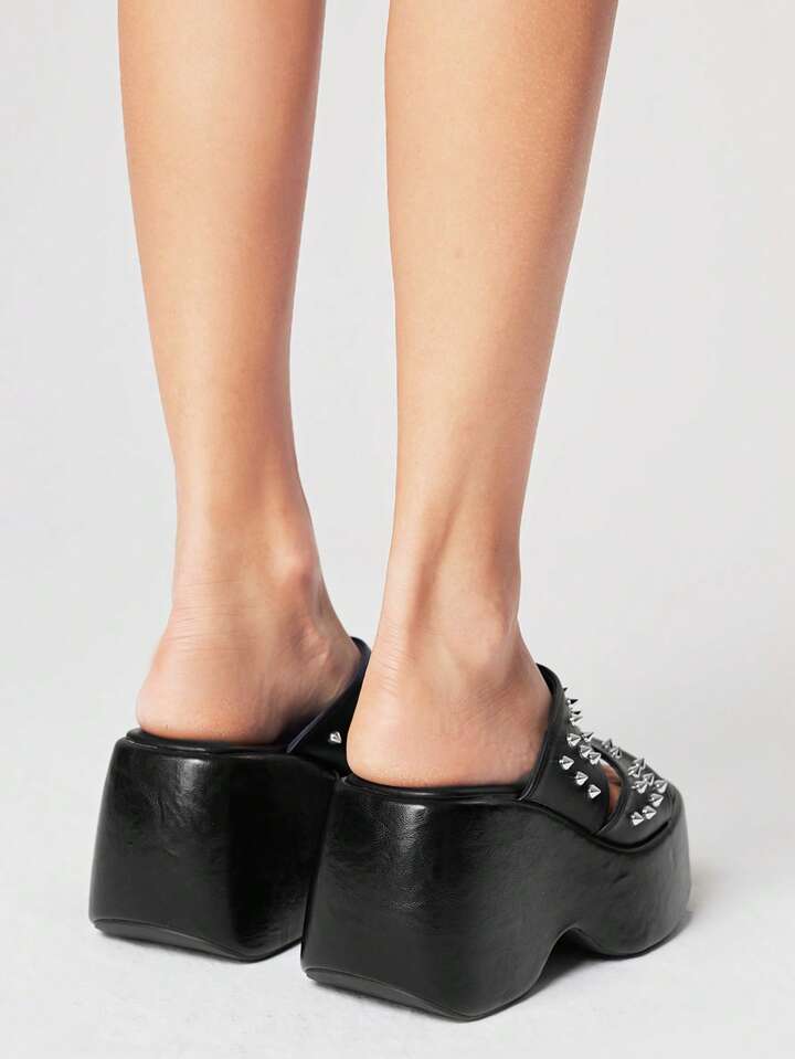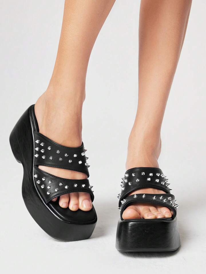 Grunge Punk Women's Black Square Toe Platform Wedge Heel Gothic Punk Heart Studded Buckle Fashion Sandals