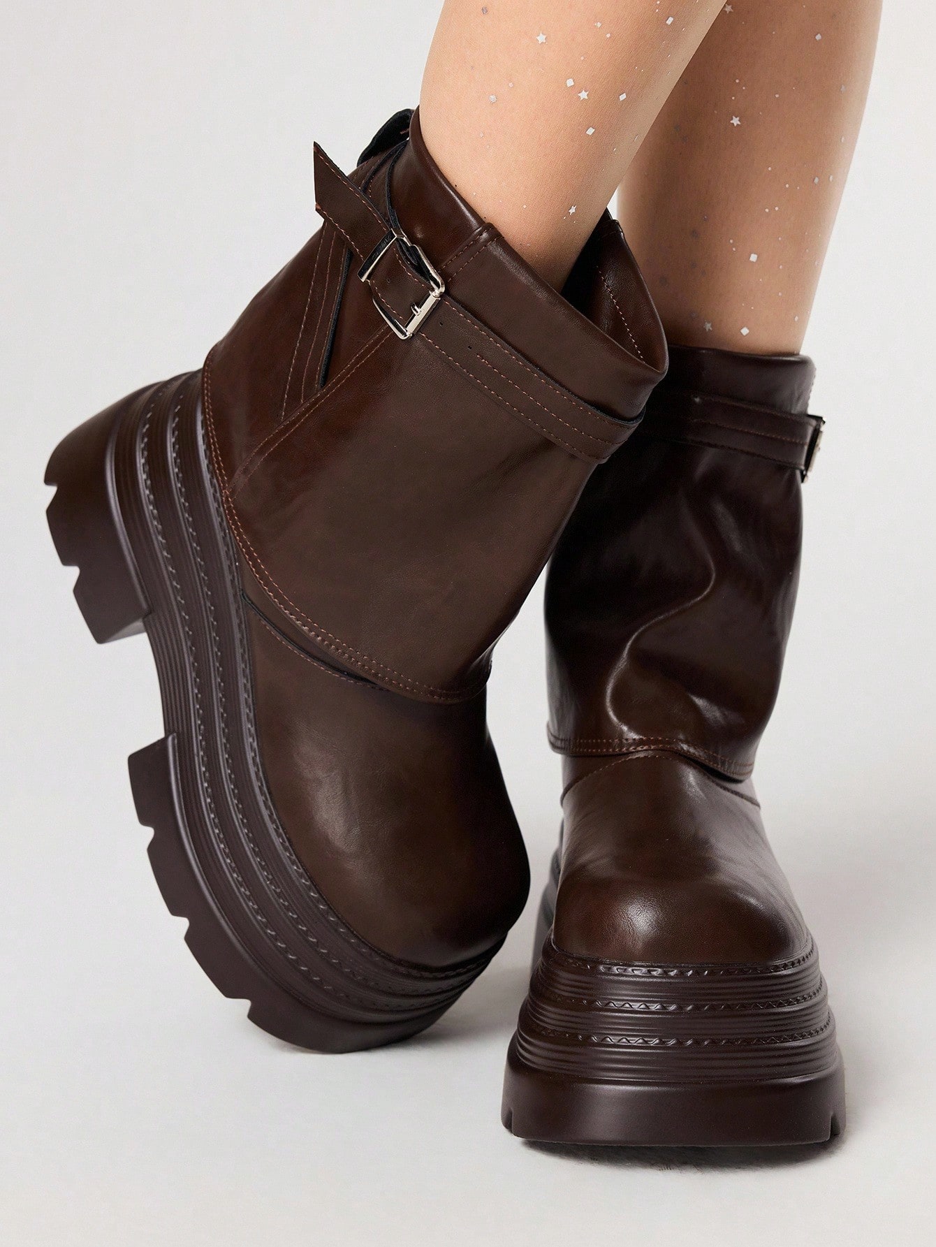 Grunge Punk Women's Dark Punk Goth Boots, Brown Shaft Western Boots, Platform Thick Sole Buckle Strap Riding Boots, Ankle Boots And Short Boots