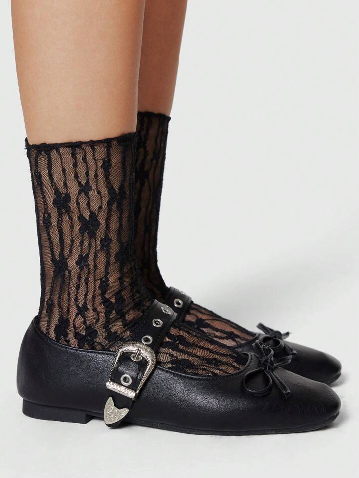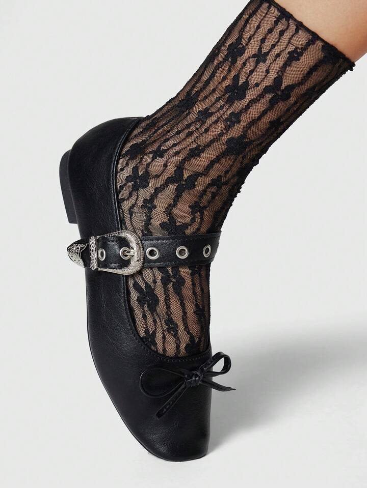 Grunge Punk Women's Dark Punk Rock Party Closed Toe Mary Jane Shoes With Strap, Black Loafers With Bow, Soft Bottom Ballet Flat Shoes