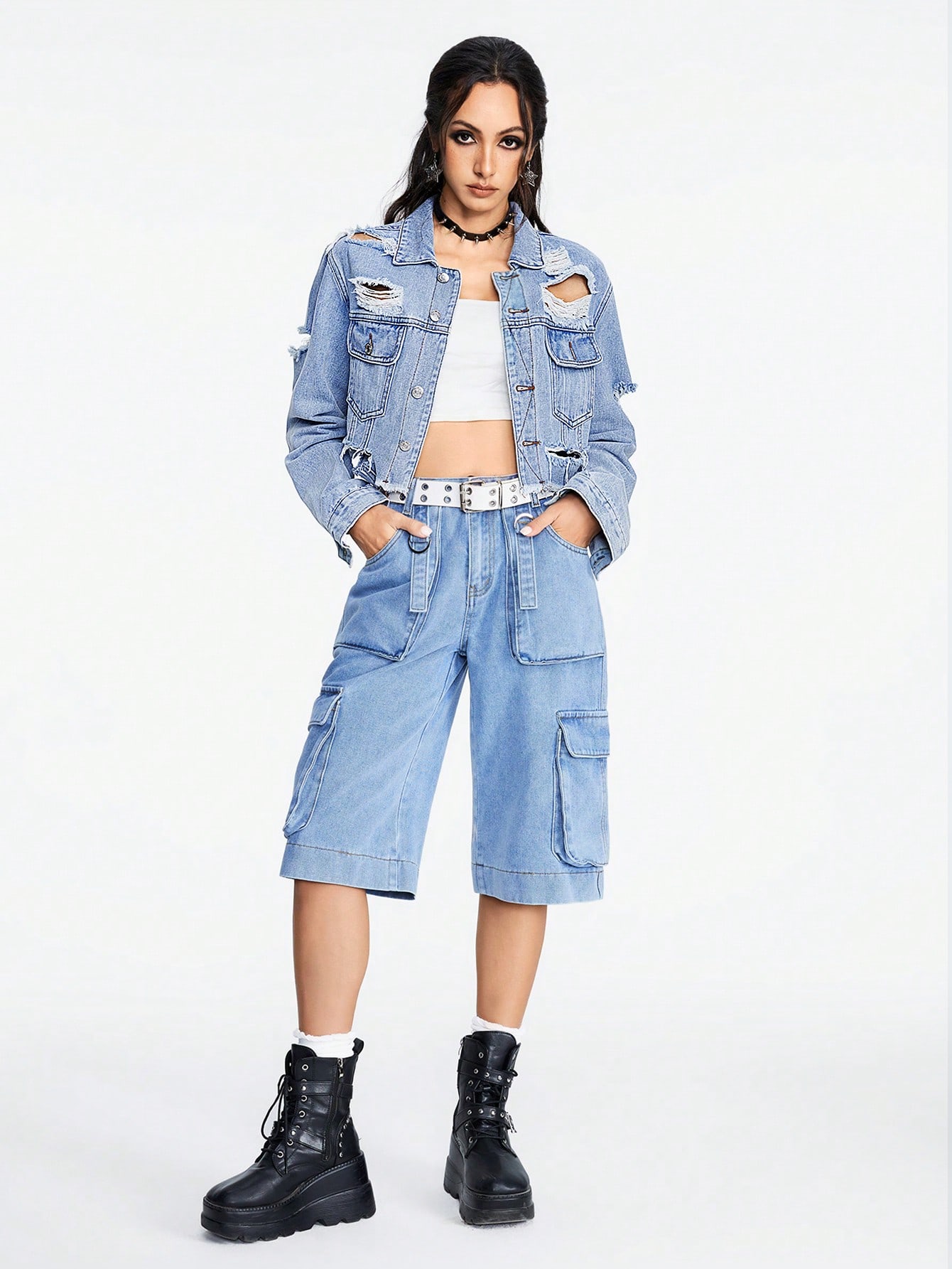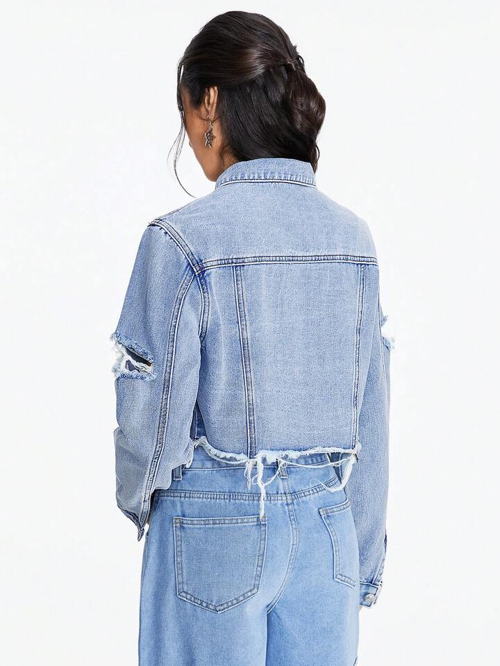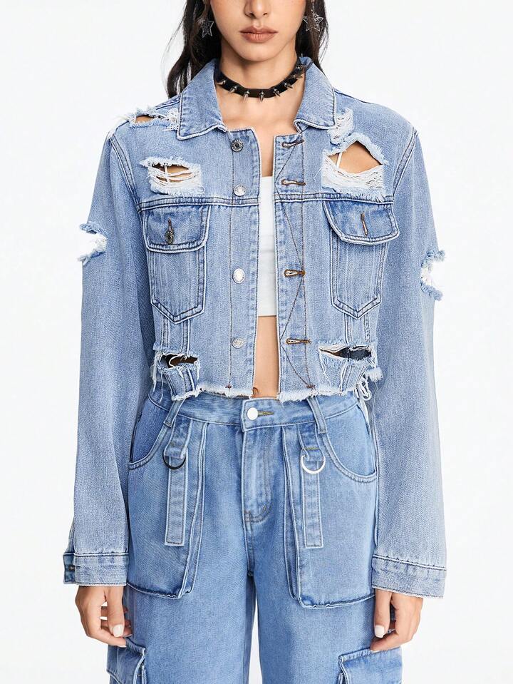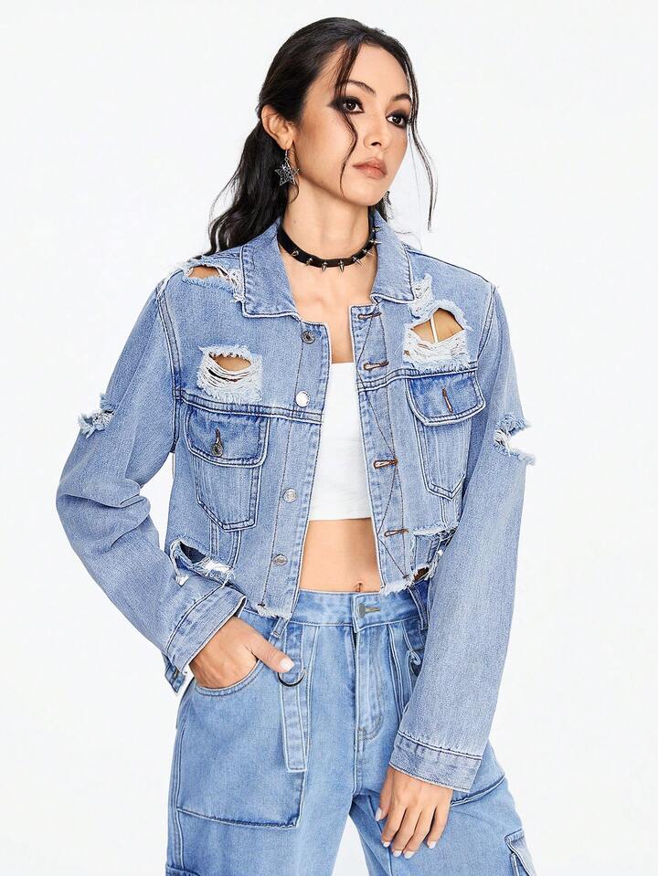 Grunge Punk Women's Distressed Denim Cropped Jacket