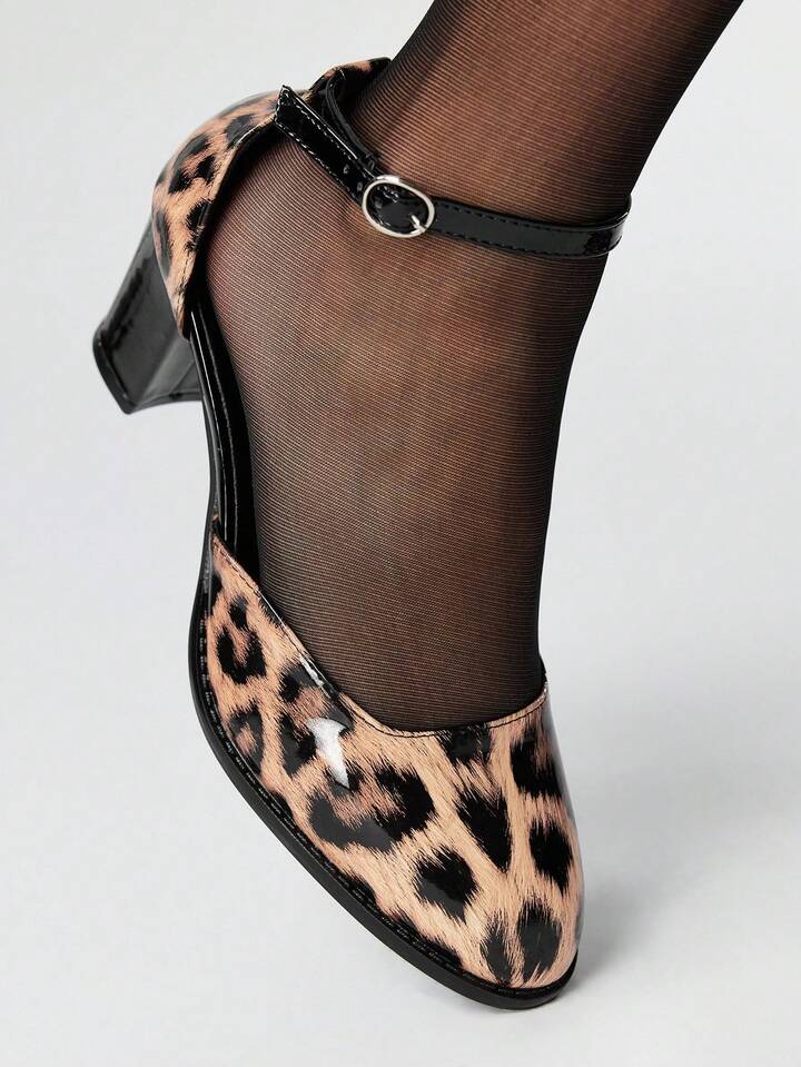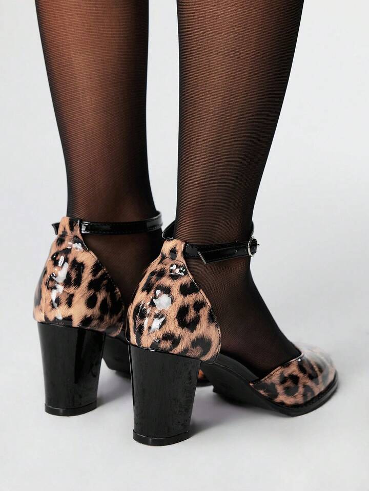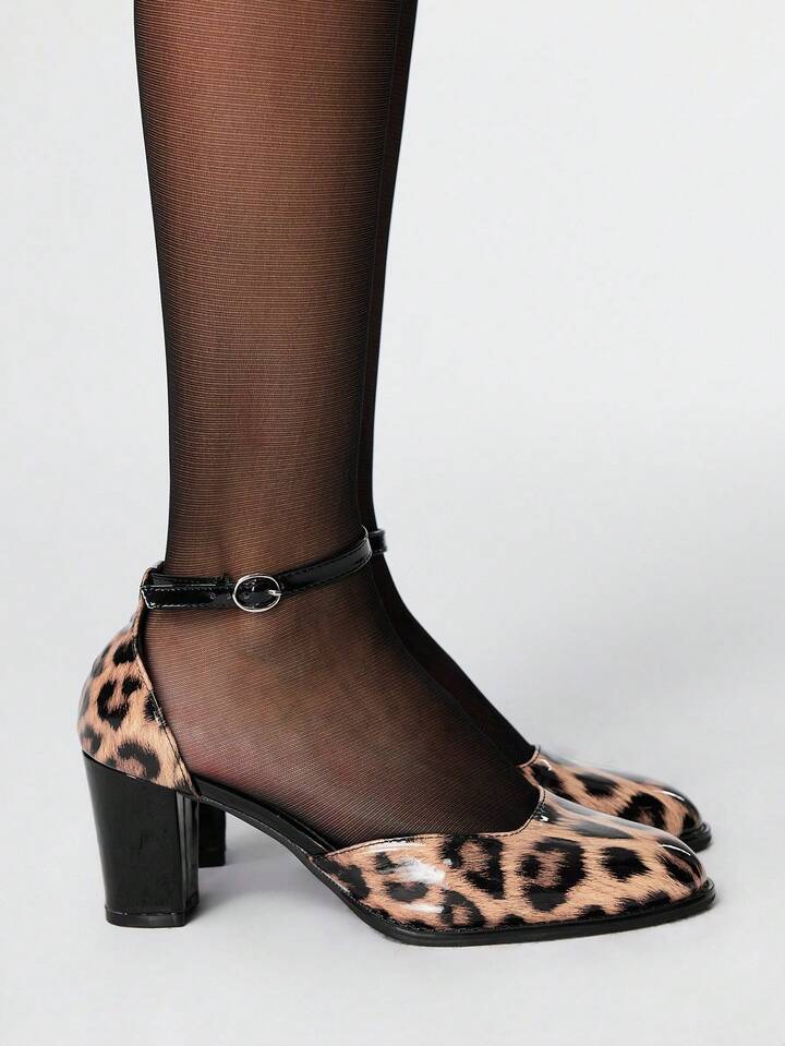 Grunge Punk Women's Fashion Brown Leopard Print High Chunky Heel Round Toe Hollow Out Pumps (Shoe Upper Floral Pattern Random)