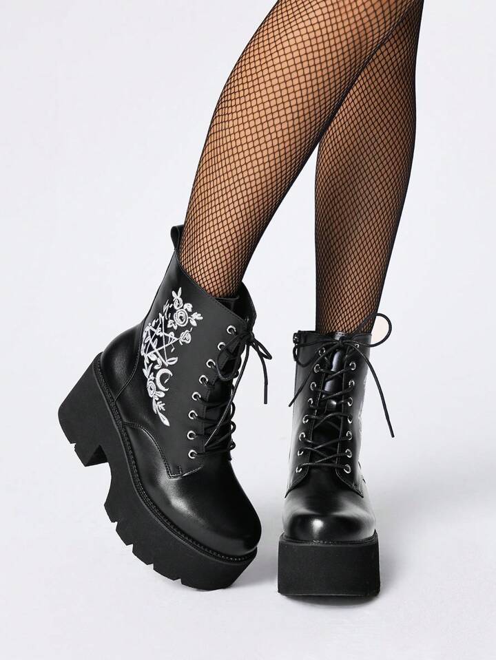 Grunge Punk Women's Fashion Lace Up Platform Ankle Boots, Gothic Style Floral Embroidery Side Zipper Combat Boots