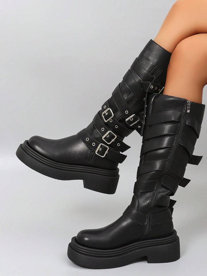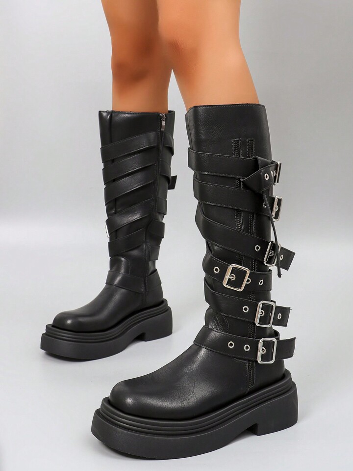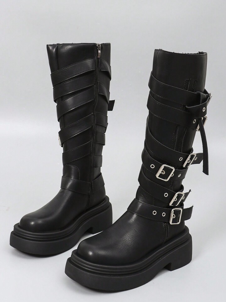 Grunge Punk Women's Goth Cosplay Punk Boots Fashion Metal Buckle Wedges High Heels Shoes Ladies Round Toe Platform Knee High Boots
