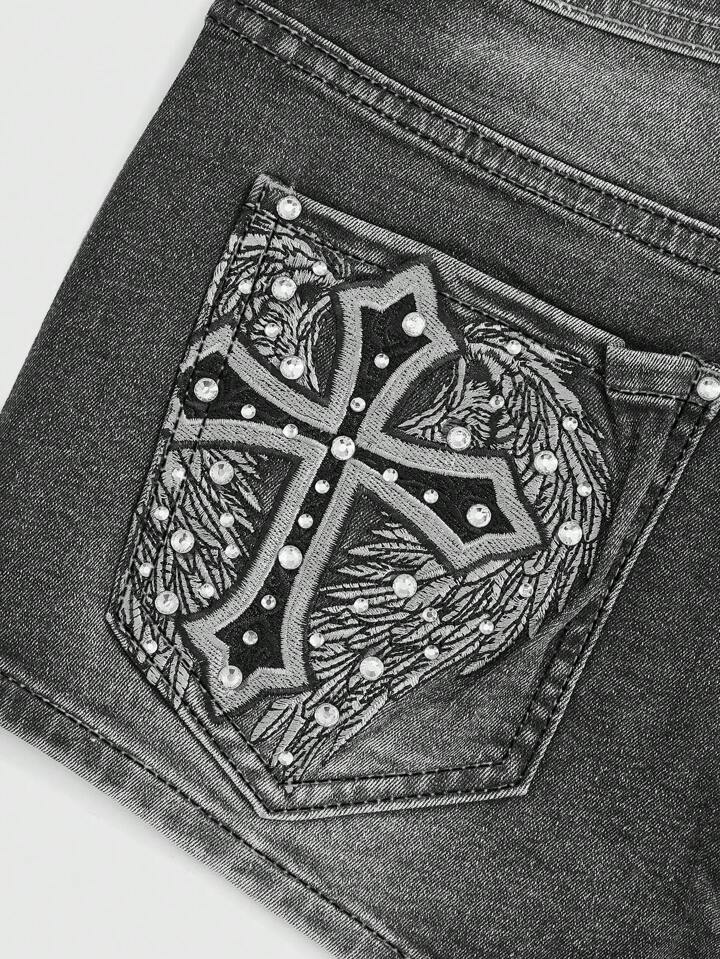 Grunge Punk Women's Gyaru Summer Retro Cross Embroidery Rhinestone Super Low Waist Denim Shorts, School