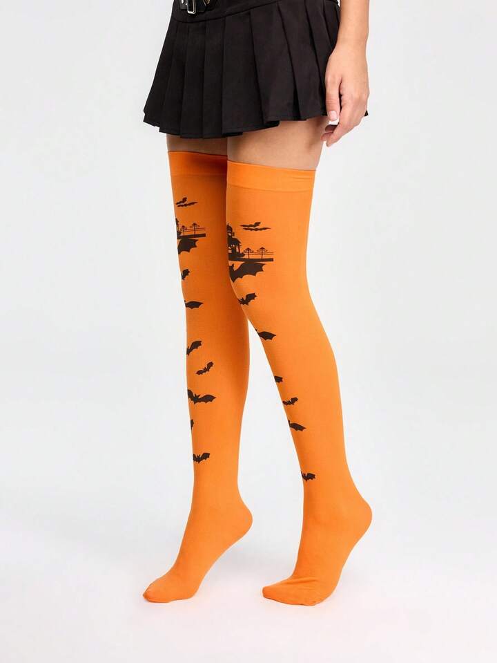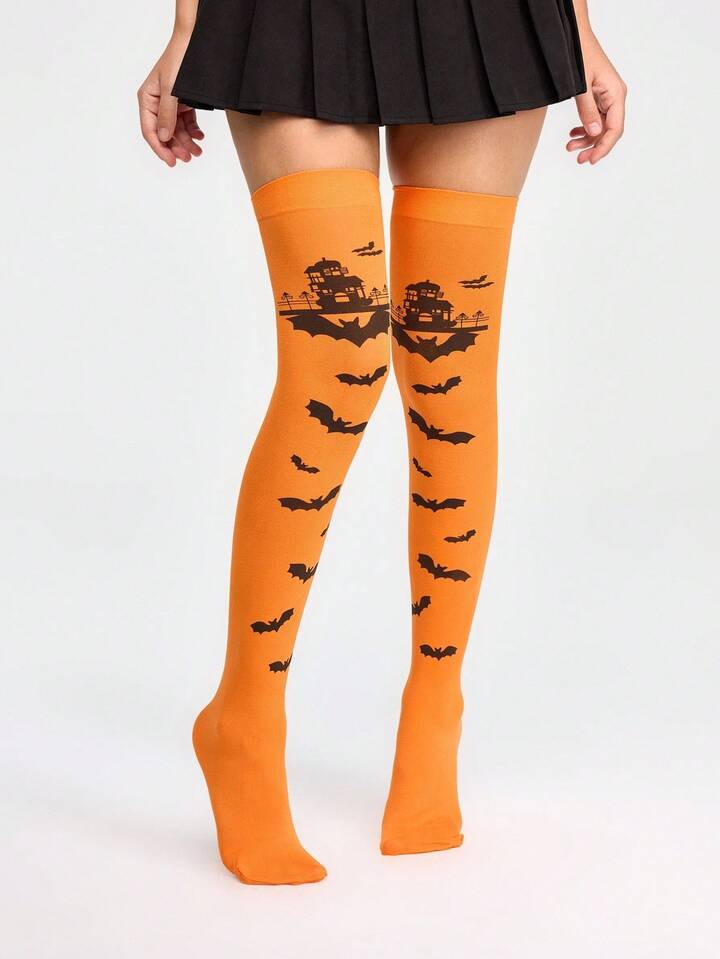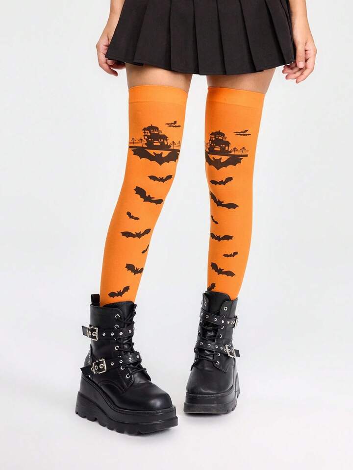 Grunge Punk Women's Halloween Fashion Bat Print Over-The-Knee Socks