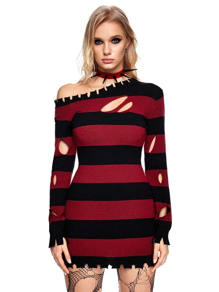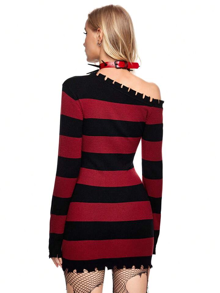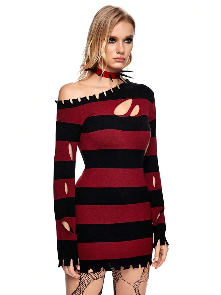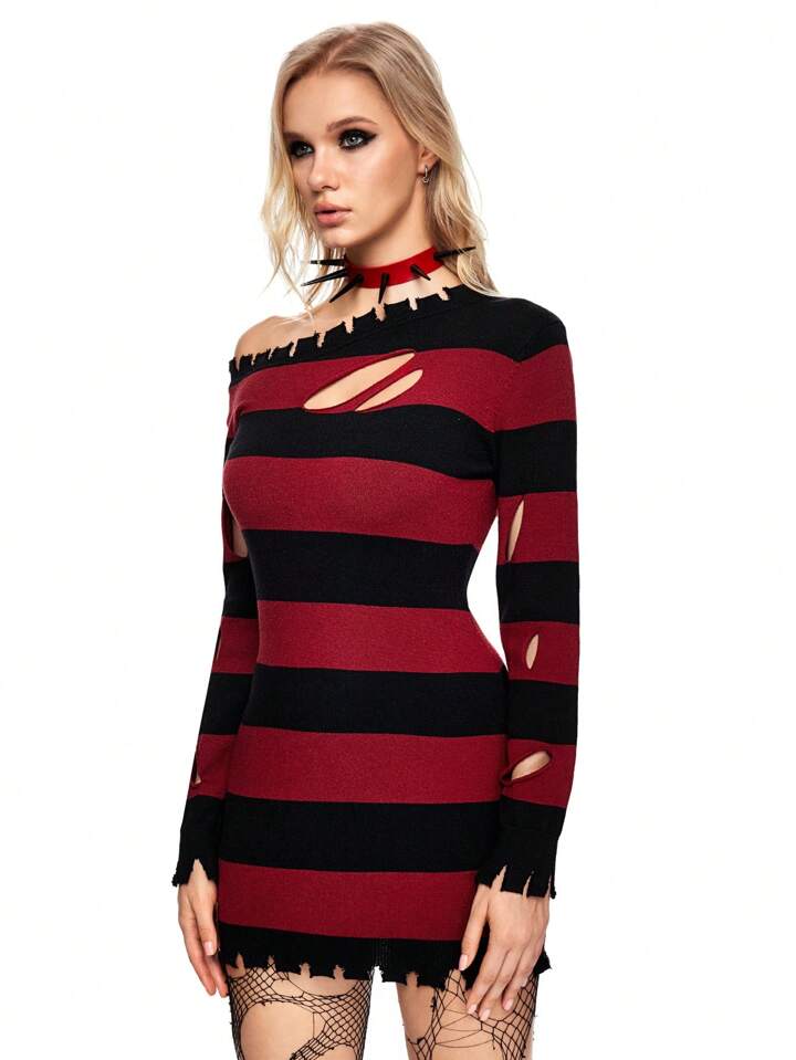 Grunge Punk Women's Long Sleeve Ripped Striped Pullover Sweater, Autumn & Winter