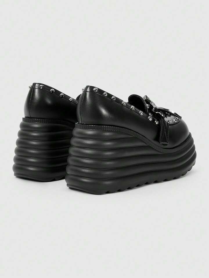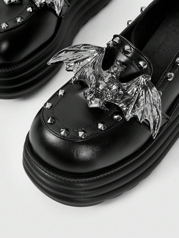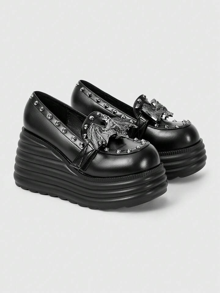 Grunge Punk Women's Metal Stud Bat Decor Round Toe Platform PU Punk Wedge Heel Shoes, Casual Punk Campus Style