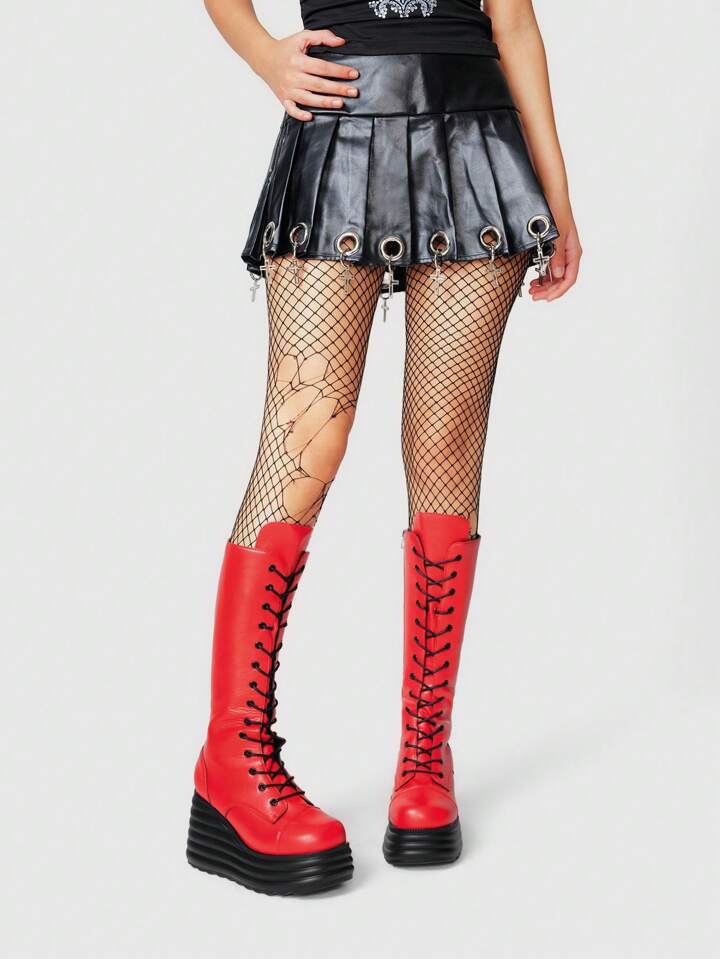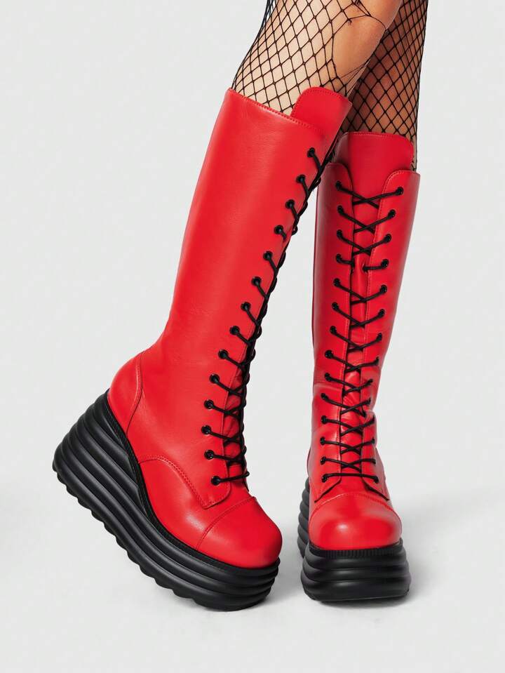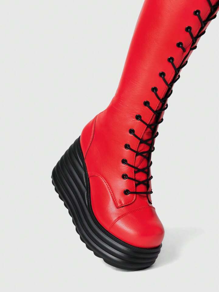 Grunge Punk Women's Red And Black Color Block Round Toe Platform Thick Sole Goth Punk Style PU Leather Mid-Calf Boots, Casual Street Punk Campus Style