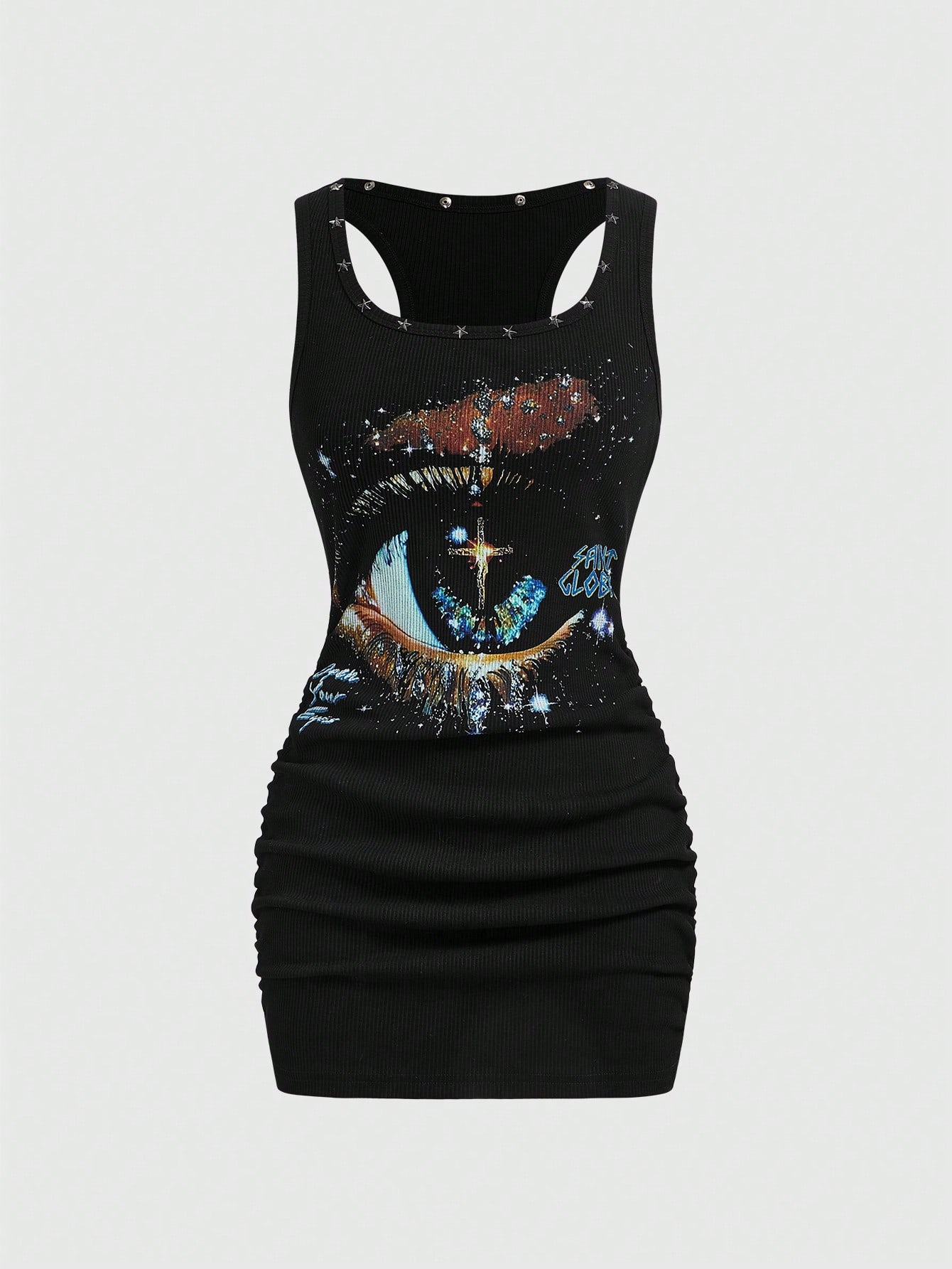 Grunge Punk Women's Retro Baddie Unisex Streetwear Starry Sky & Star Rivet Print Bodycon Mini Dress