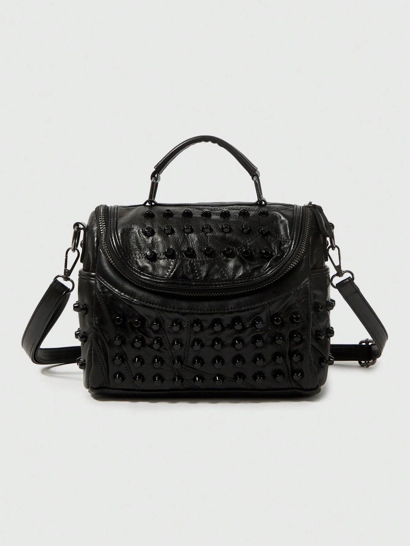 Grunge Punk Women's Rivet Decor PU Leather Fashionable Daily Black Shoulder Bag