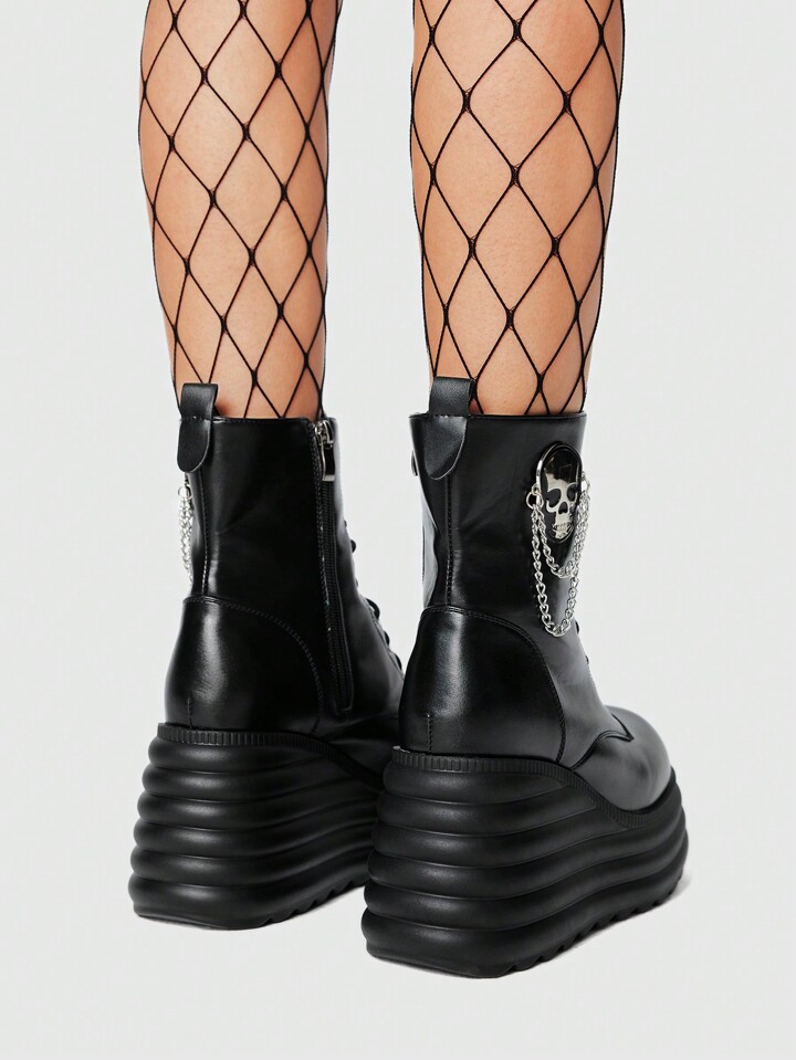 Grunge Punk Women's Skull Decor Chain Round Toe Wedge Platform Ankle Boots, PU Leather Black, Casual Hippy Punk Rock Campus Style