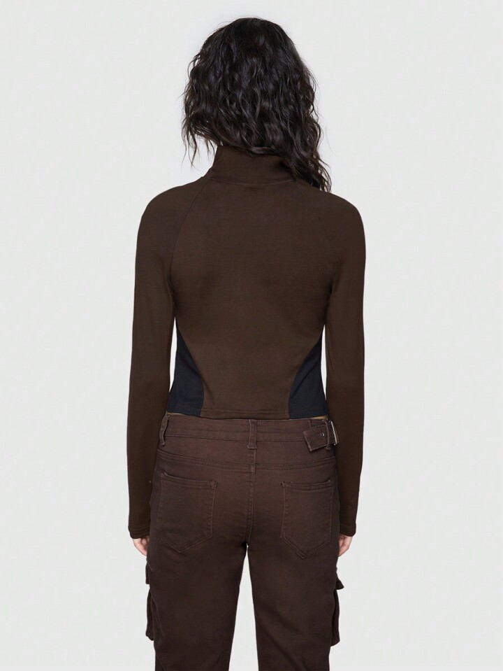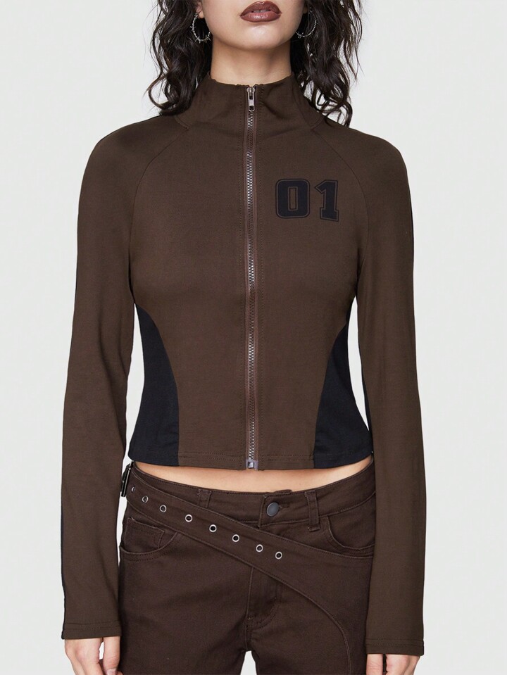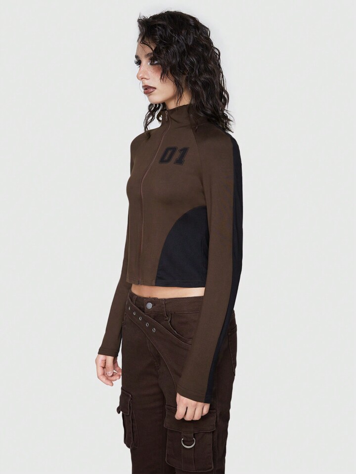 Grunge Punk Women's Slim-fit Athletic Style Color-block T-shirt With Stand Collar And Waistband