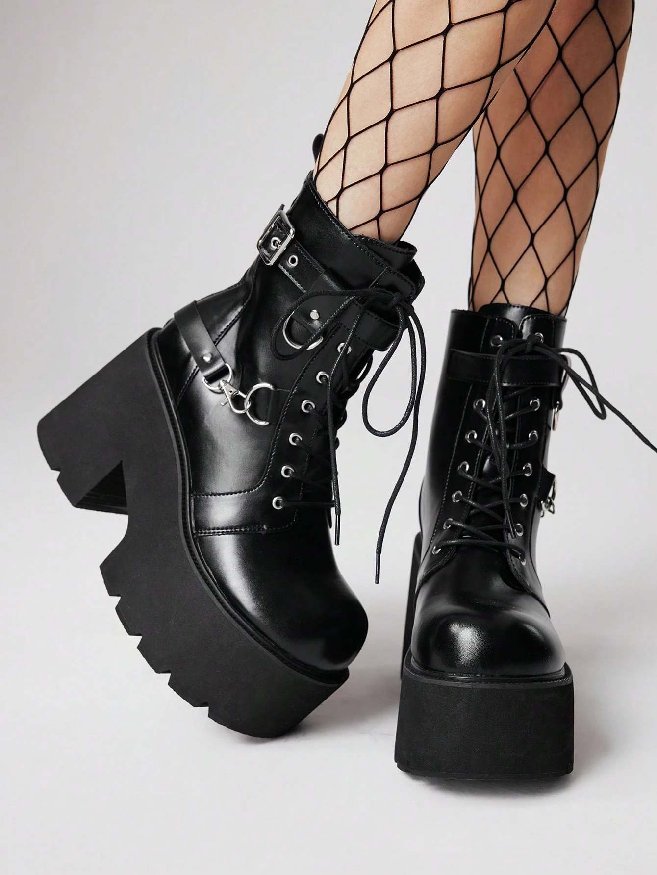 Grunge Punk Women's Solid Color Leather Punk Style Thick Heel Short Boots, Gothic Sexy Waterproof Platform Metal Double Buckle Decor Comfortable Fashion Wedge Ankle Boots