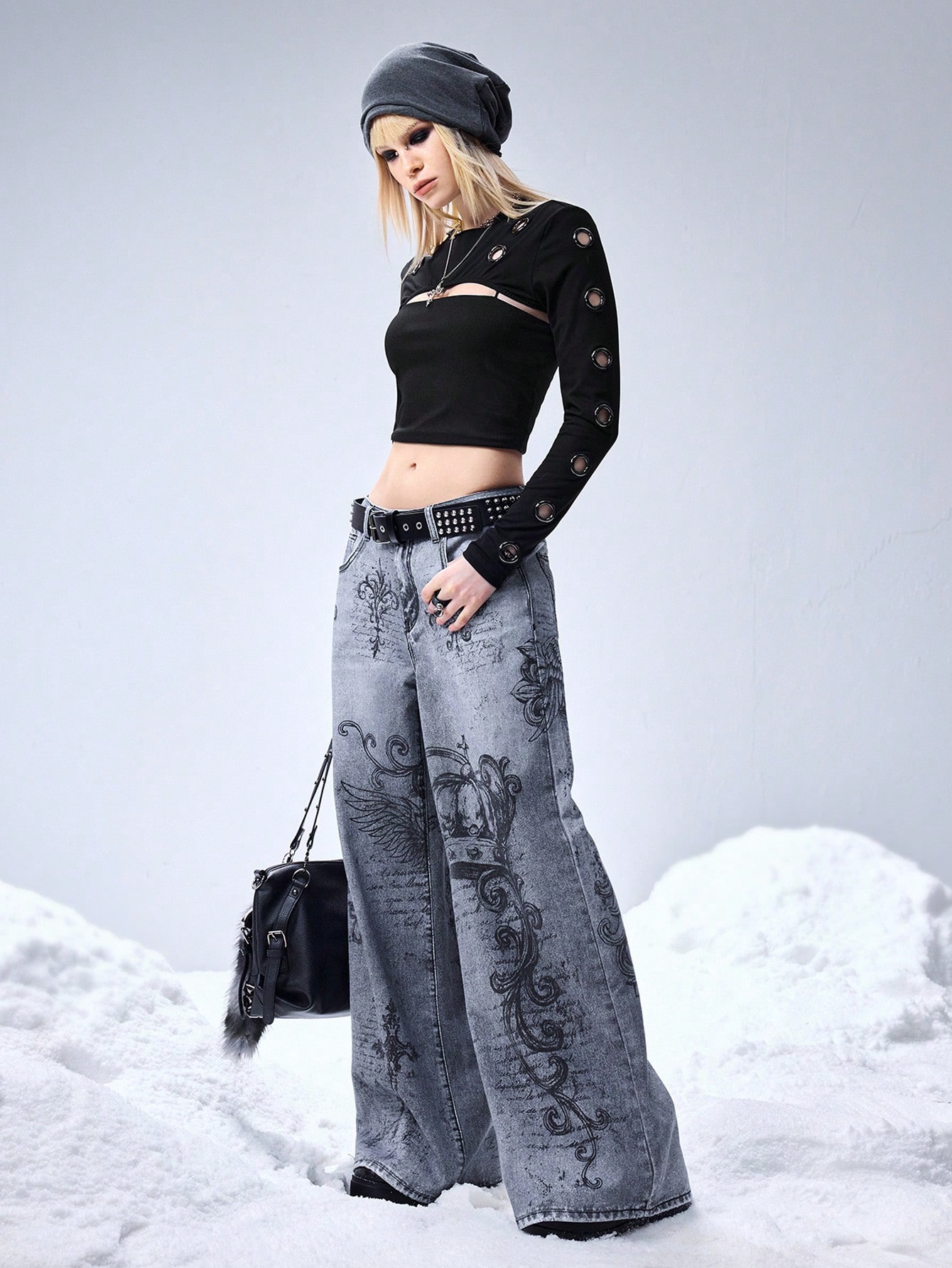 Grunge Punk Women's Solid Color Round Neck Long Sleeve Cropped Top