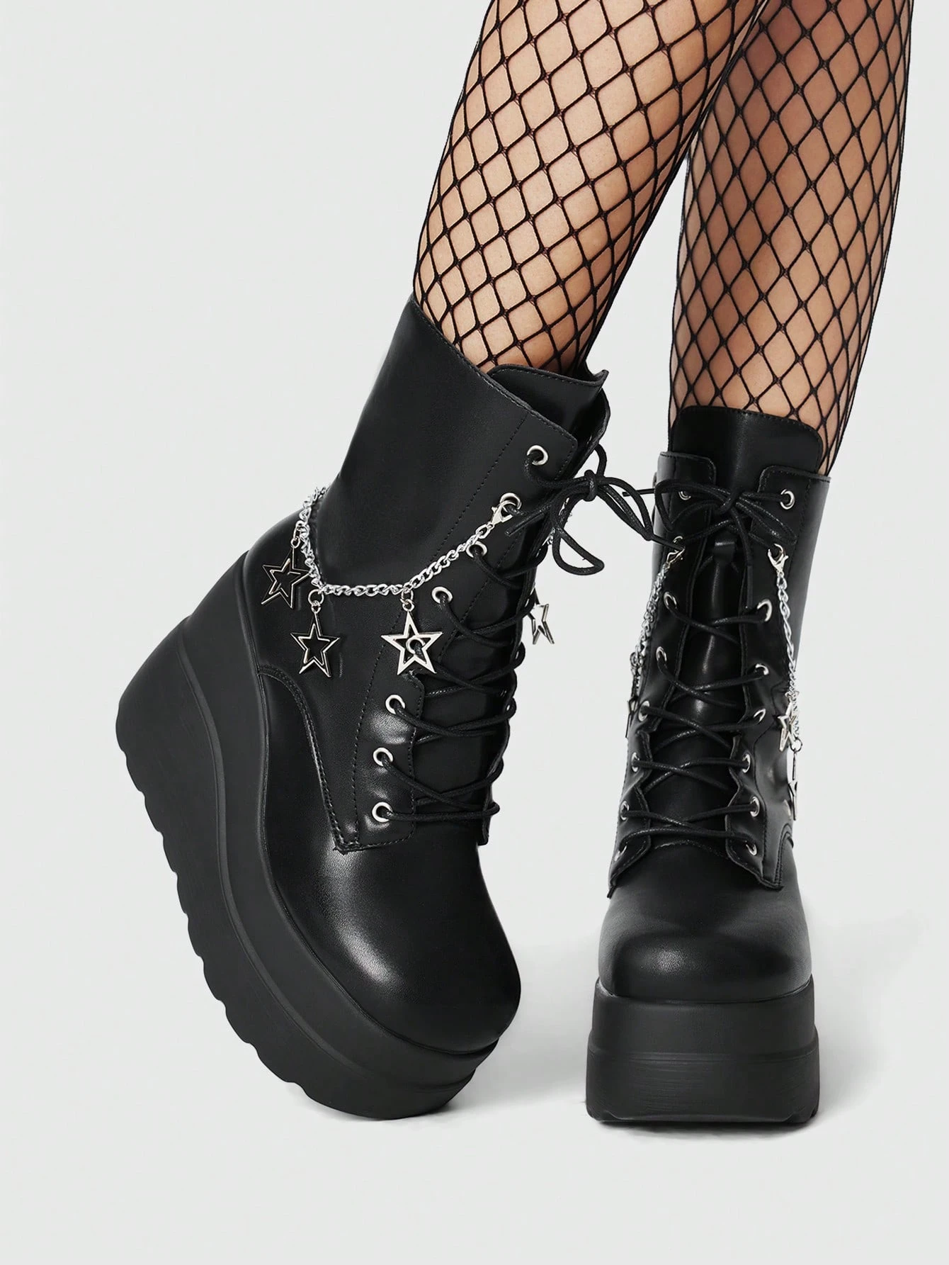 Grunge Punk Women's Star Charm Thick Bottom Wedge Heel Punk PU Black Ankle Boots, Everyday Dark Punk Rock Campus Wear