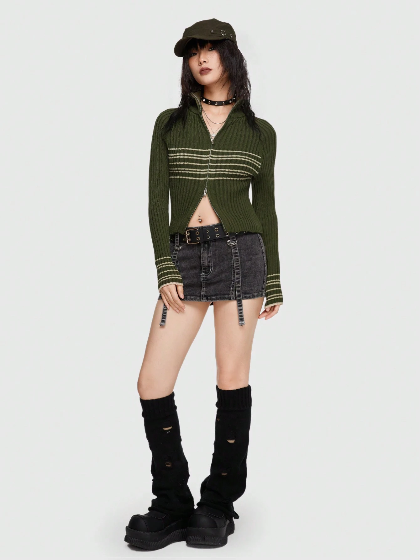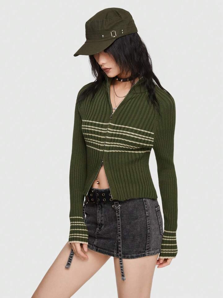 Grunge Punk Women's Striped Zipper Front Cardigan Sweater