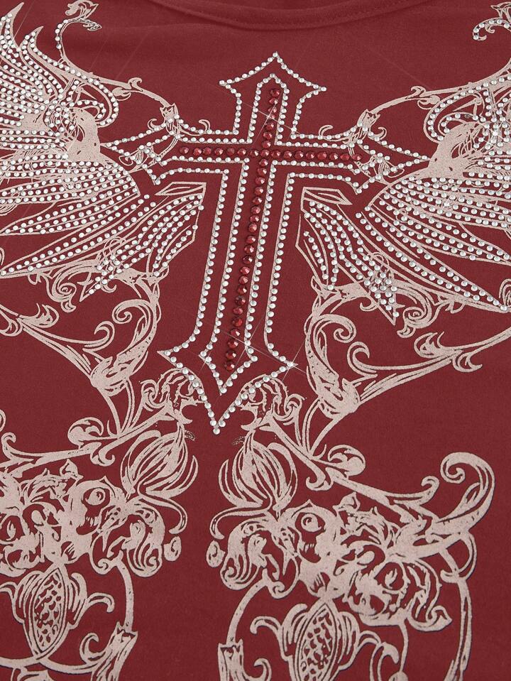 Grunge Punk Women's Summer Rhinestone Cross & Wing Print Off-Shoulder Short Sleeve Casual T-Shirt