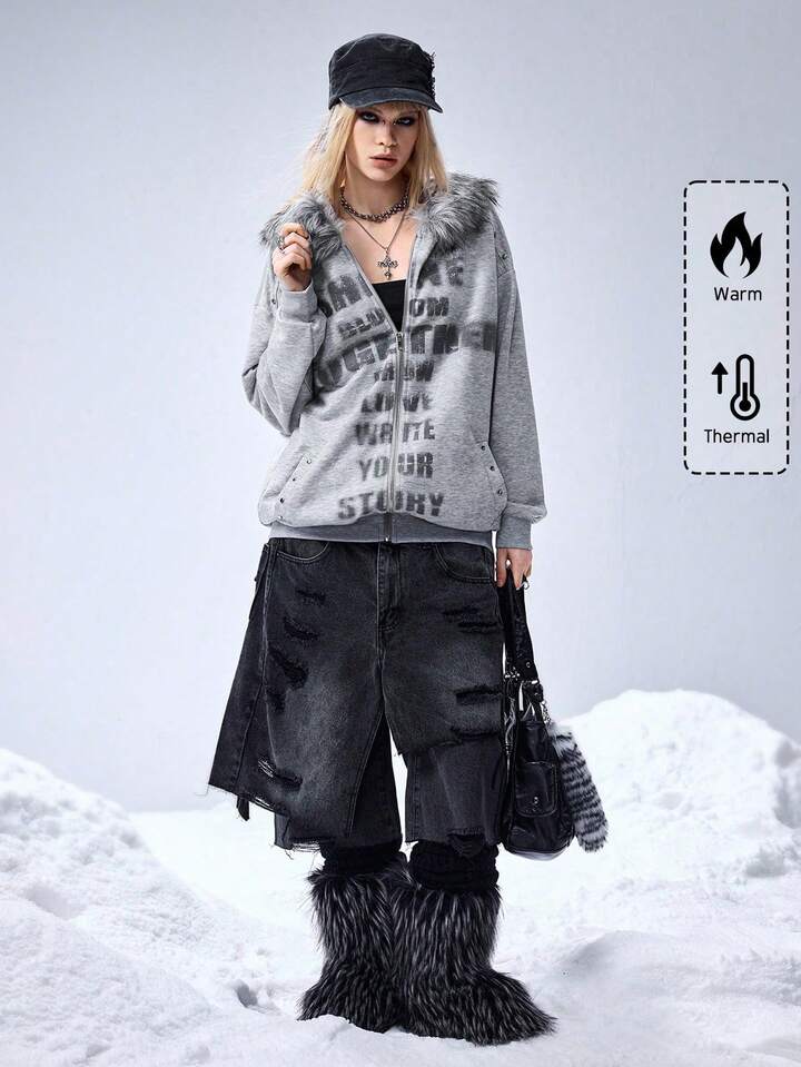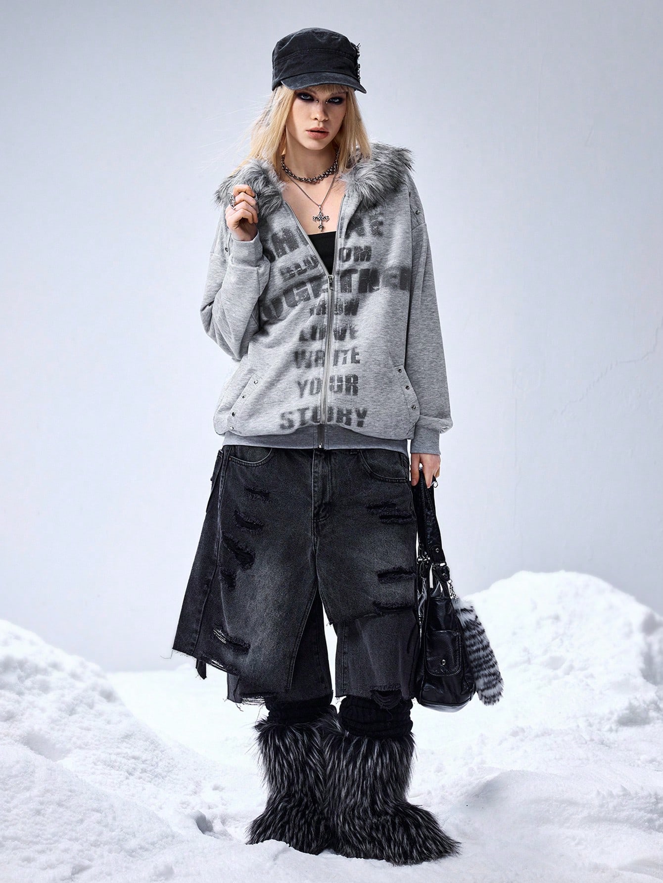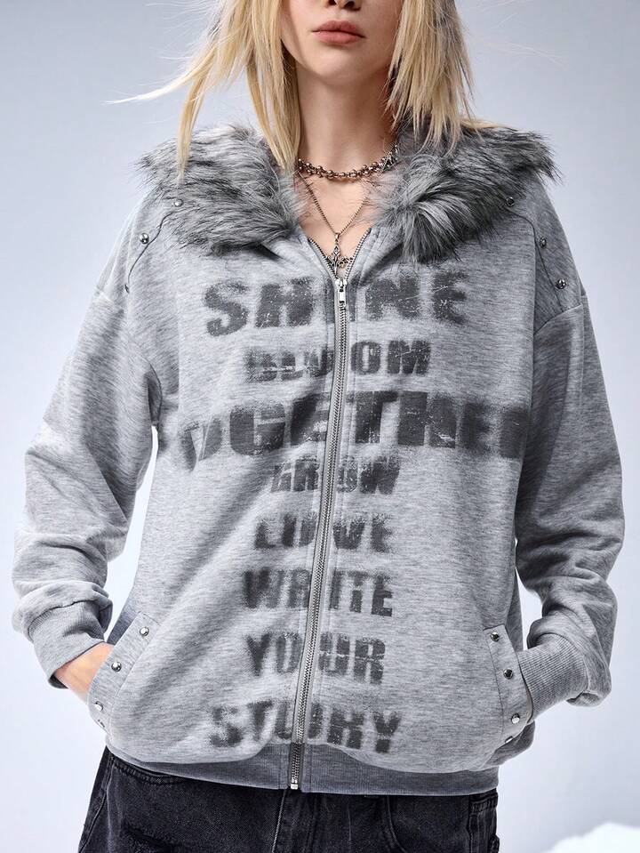 Grunge Punk Women's Y2K Millennium Vintage PUNK English Slogan Print Patchwork Faux Fur Collar Hoodie