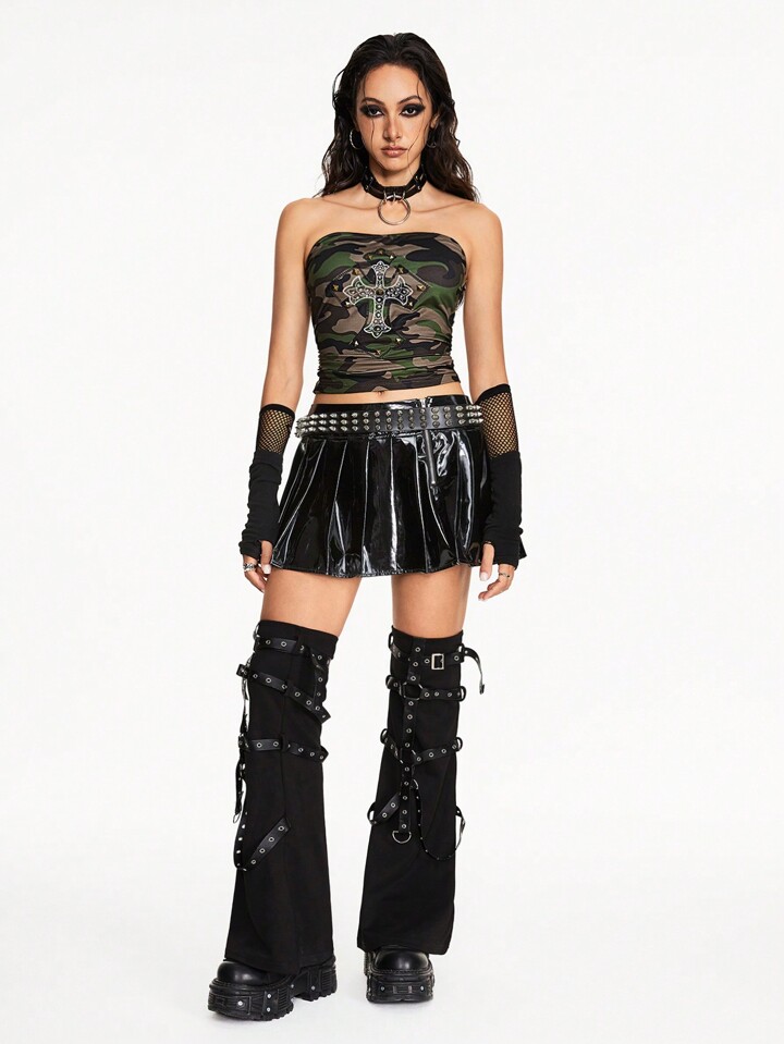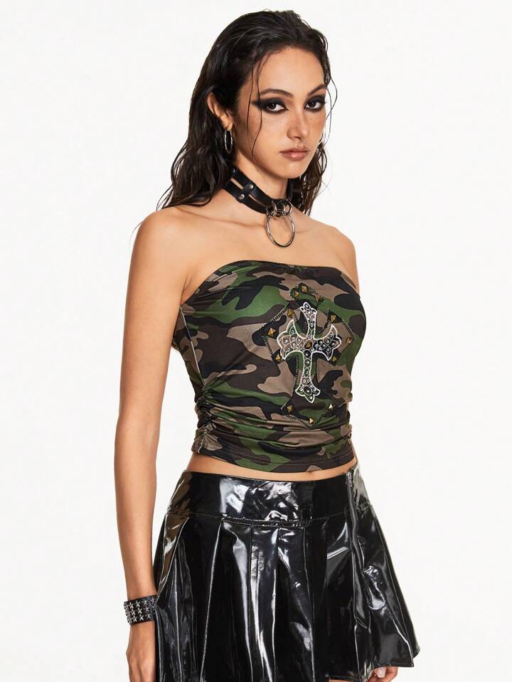 Grunge Punk Y2K Camouflage Cross Applique Stud Rhinestone Subculture Sexy Women Tube Top, School