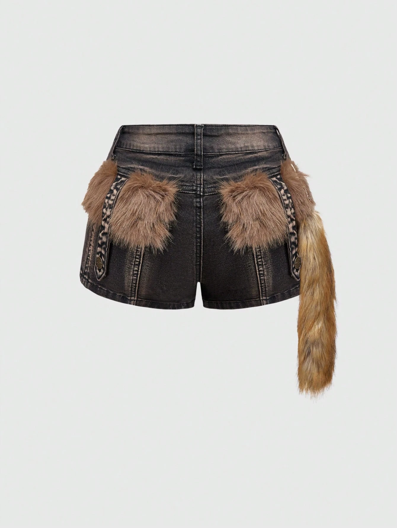 Grunge Punk Y2K Gyaru Harajuku Style Pocket Patchwork Fuzzy Tail Decor Washed Denim Micro Mini Shorts