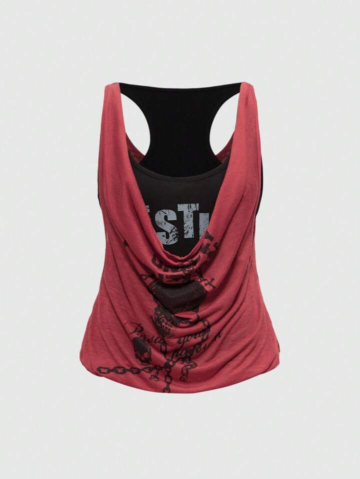 Grunge Punk Y2K Harajuku Goth Punk Skull Print Layered Look Ribbed Collar Peplum Hem Crisscross Back Tank Top