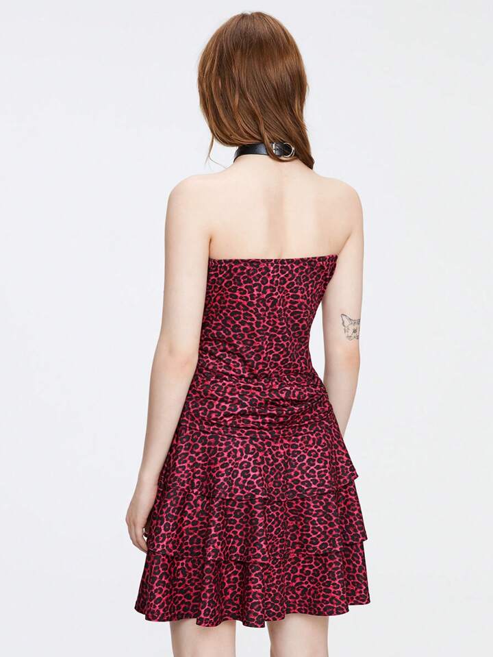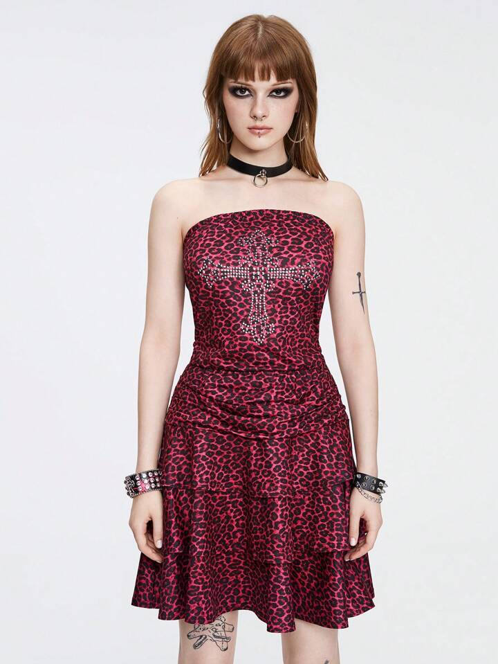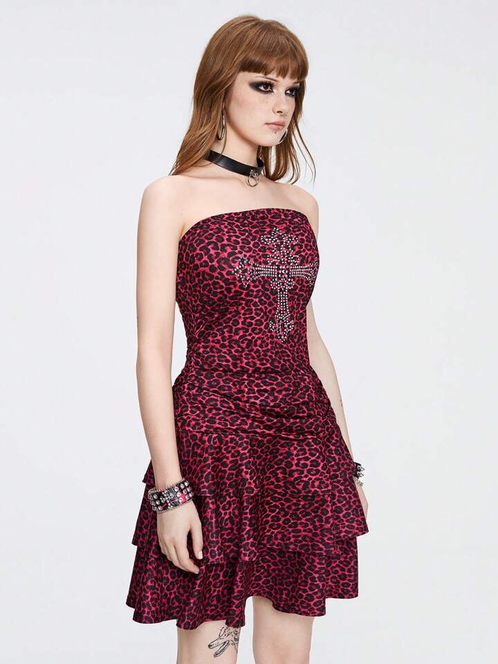 Grunge Punk Y2K Lady Cross Hot Drilling Leopard Print Three-Layer Dress Hem Strapless Dress